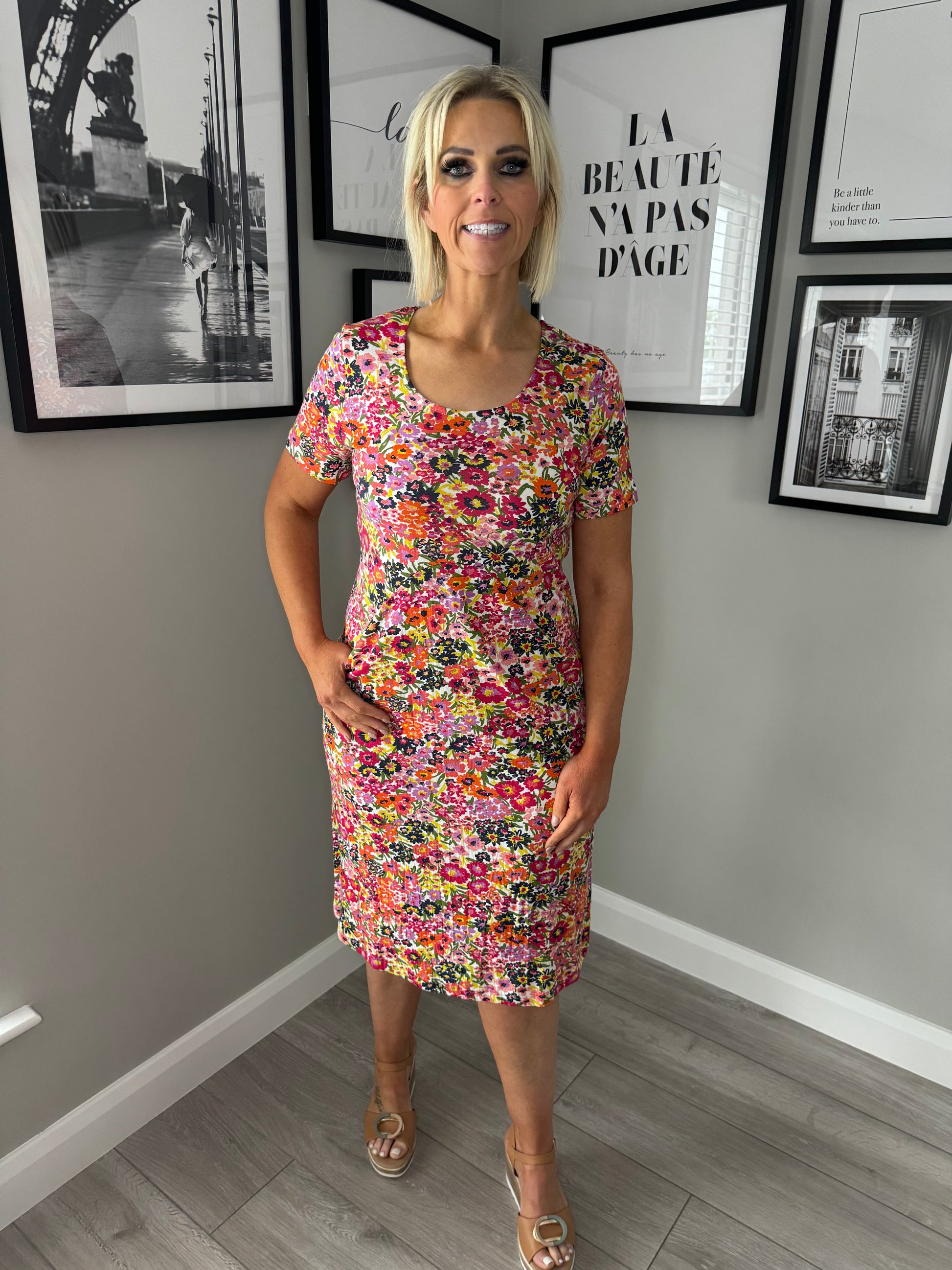 Adini pull on dress with short sleeves, round neckline & slouched double pockets to either side. Printed throughout in a vintage ditsy floral print. Normal fitting.