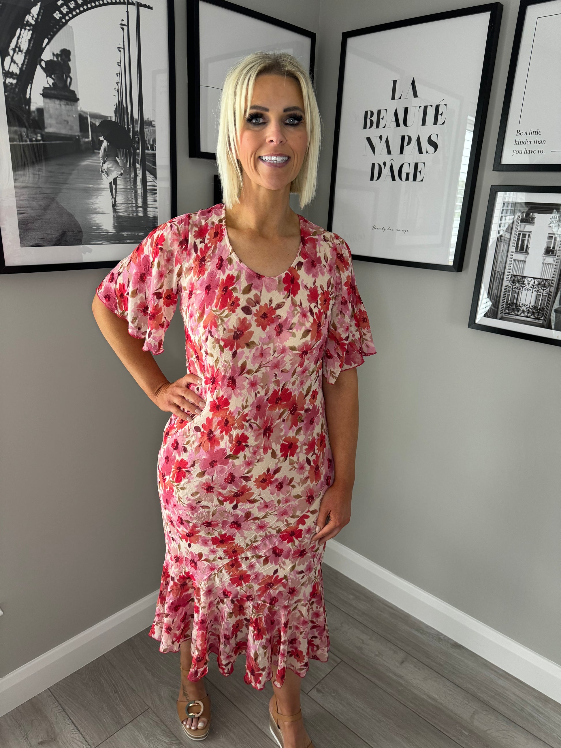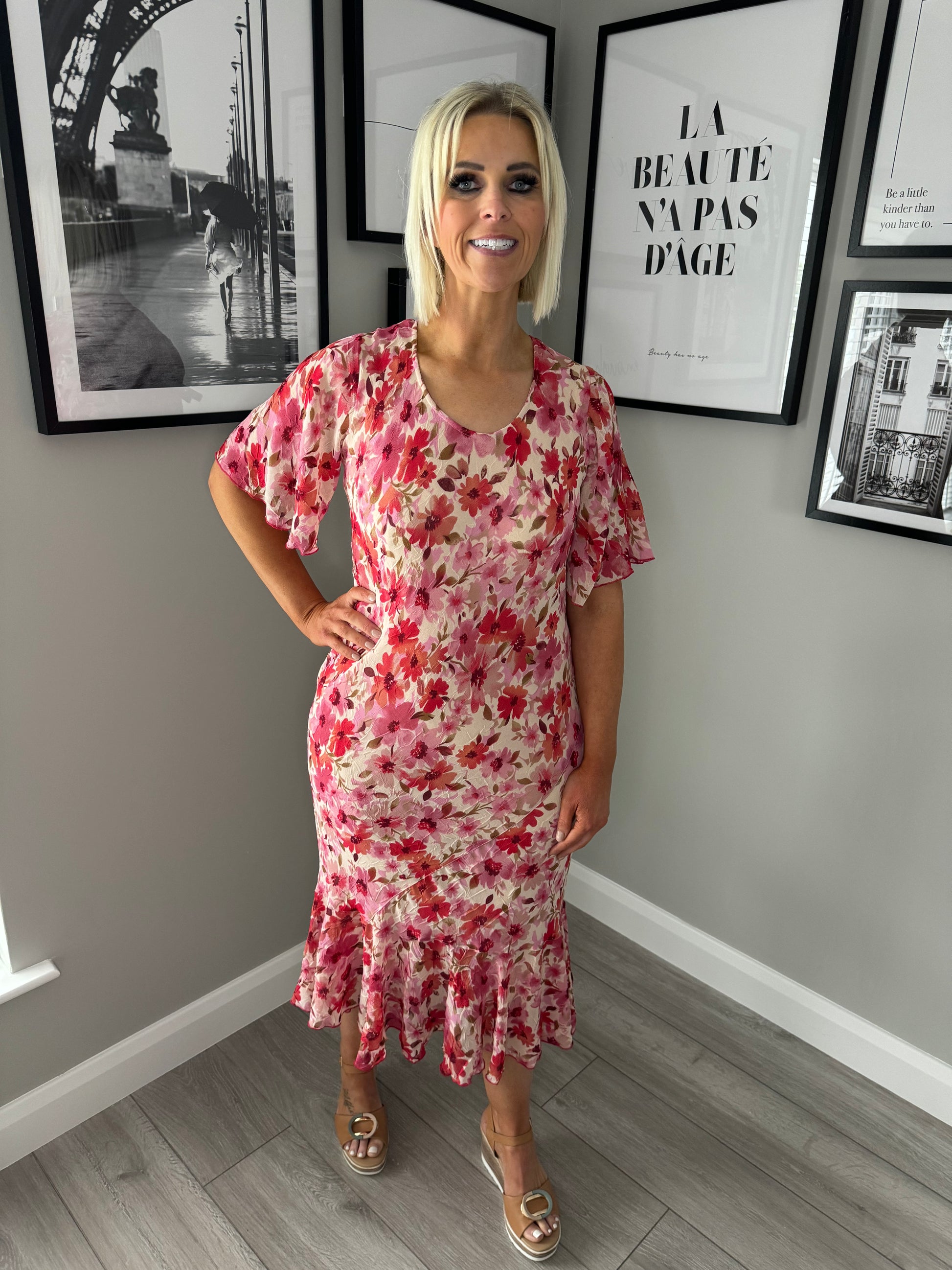 Adini pastel multi tonal pink printed dress in vintage floral. Short flutter sleeves, round neckline & frilled hemline. Pull on. True to size.