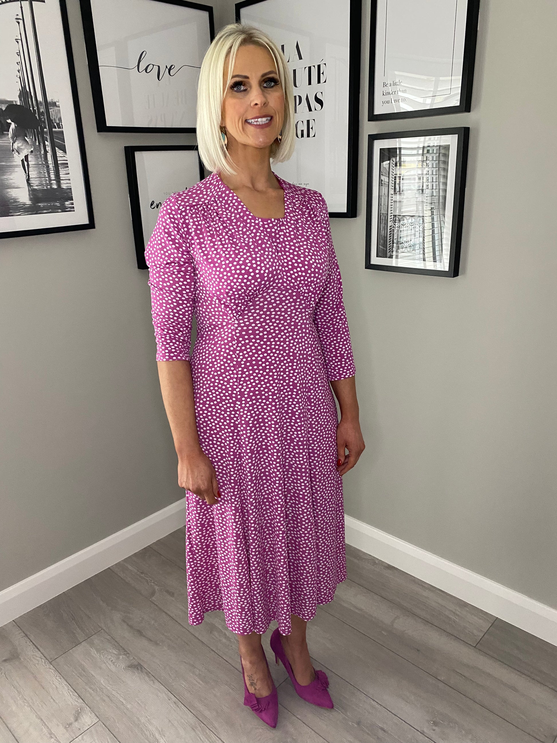 Our Anonymous spotted dress is a beauty! In beautiful magenta with small white polka dot it's printed but not in your face. With slight stretch material its appears a great shape by clinching in the waist before falling to a slight flared skirt. We've matched it with our Sorento Westerham magenta shoes & what a match it is.