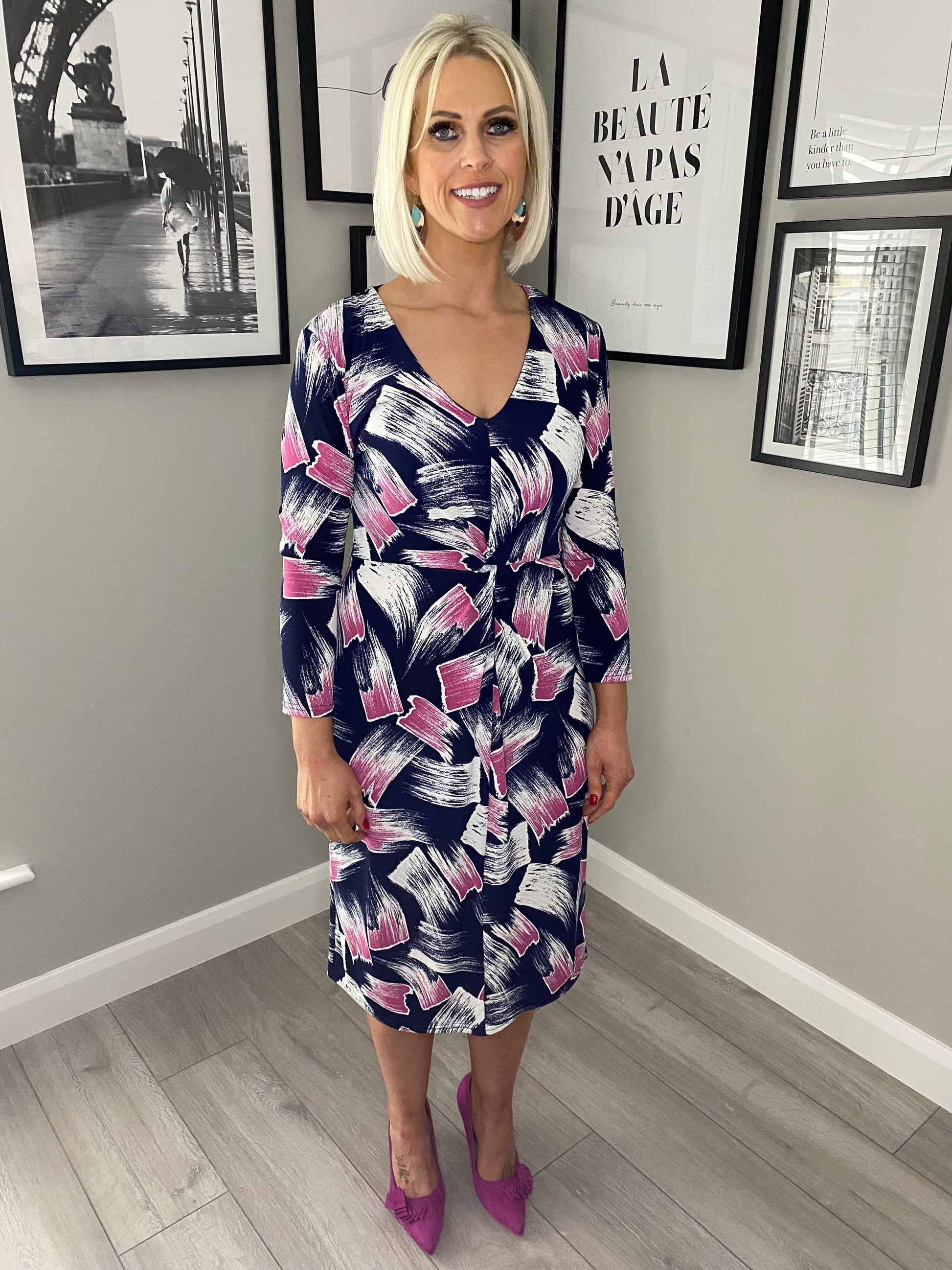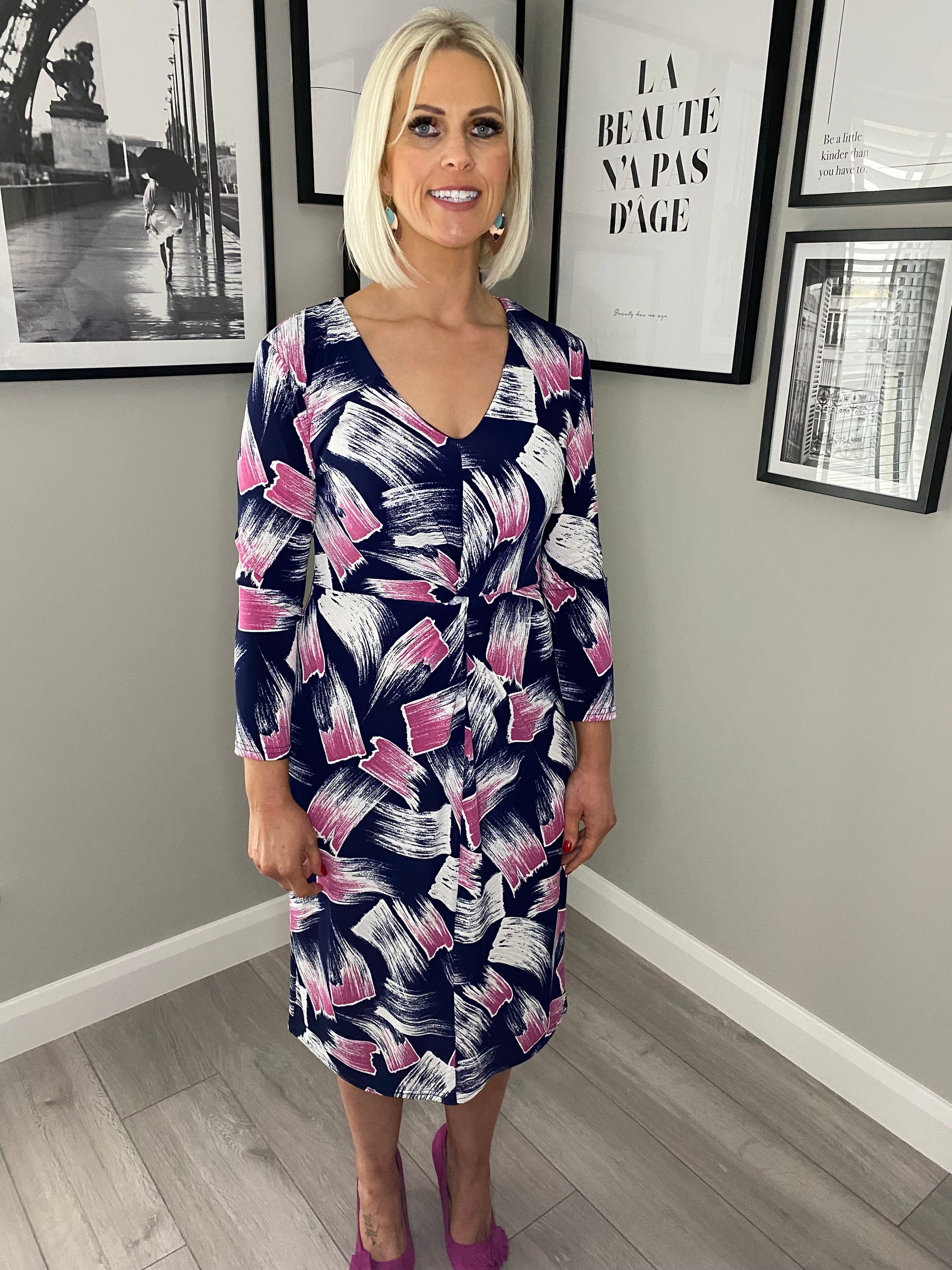Our Anonymous three tone printed dress combines a deep navy, white & bright magenta pink in this abstract fade effect print. This dress is fully lined with 3/4 sleeve & the waist line has a small scrunch making it super flattering on the tummy. We've matched it with our Sorento Westerham magenta shoes to pop the pink & it really works.