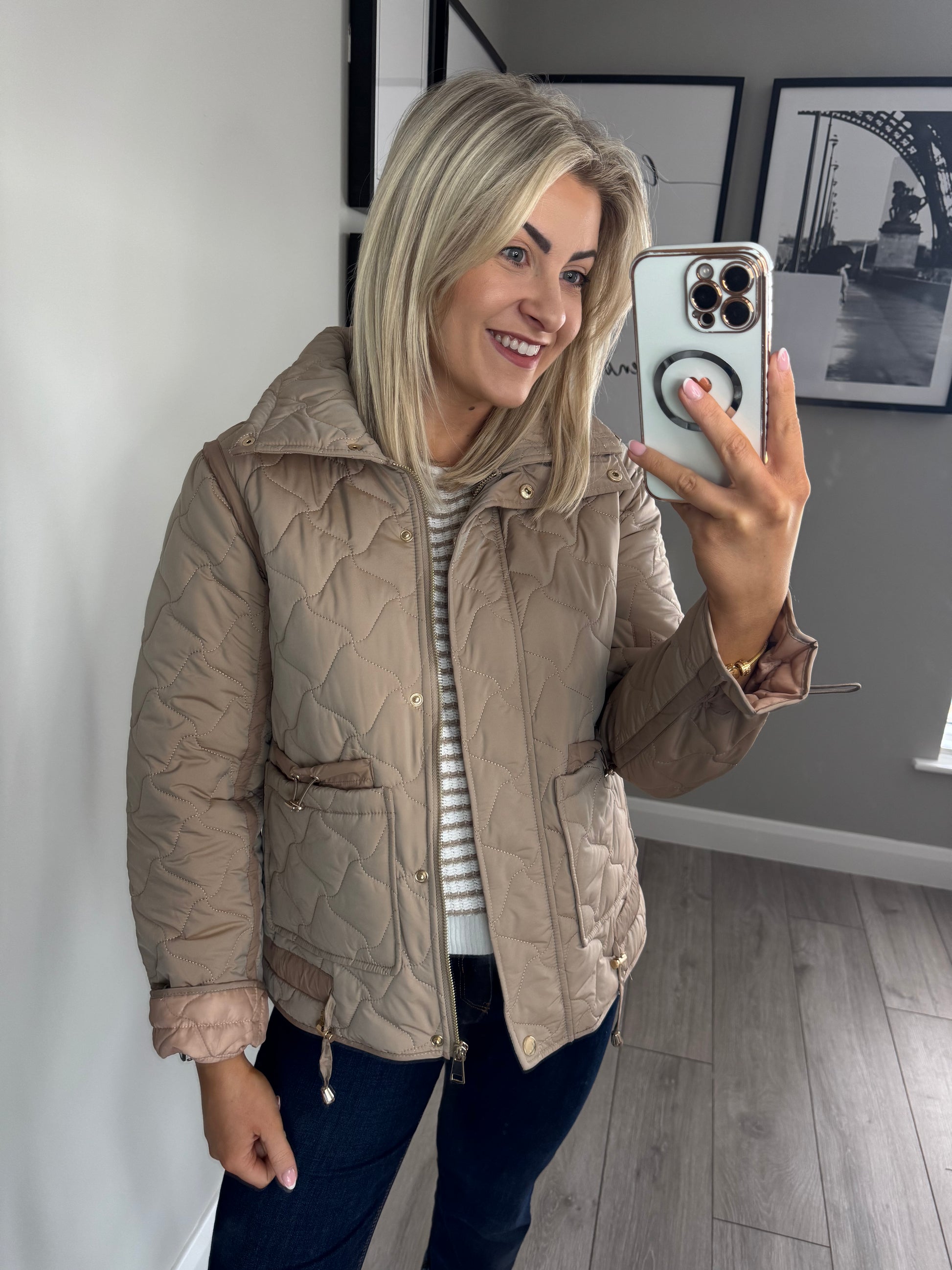 -Jessica Graaf two toned beige lightly quilted coat with large lapel collar & double pocket/drawstring detail.