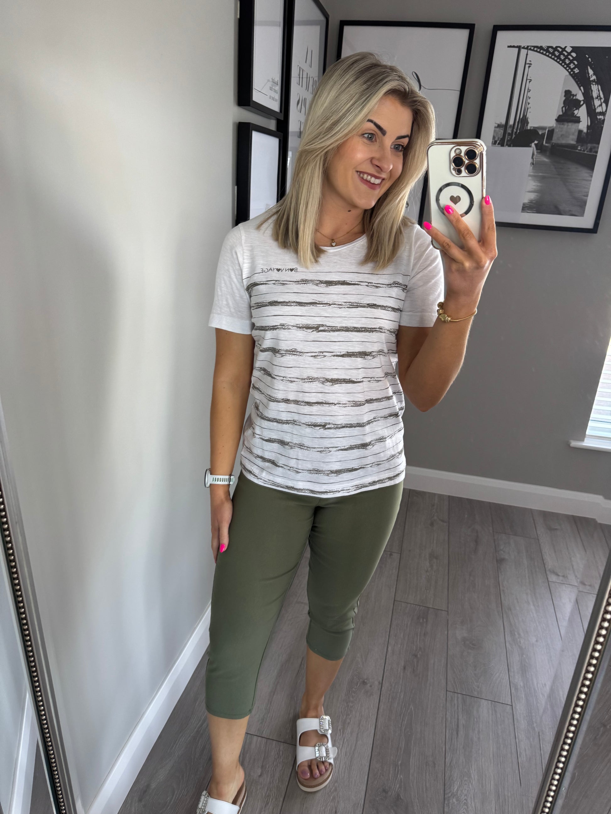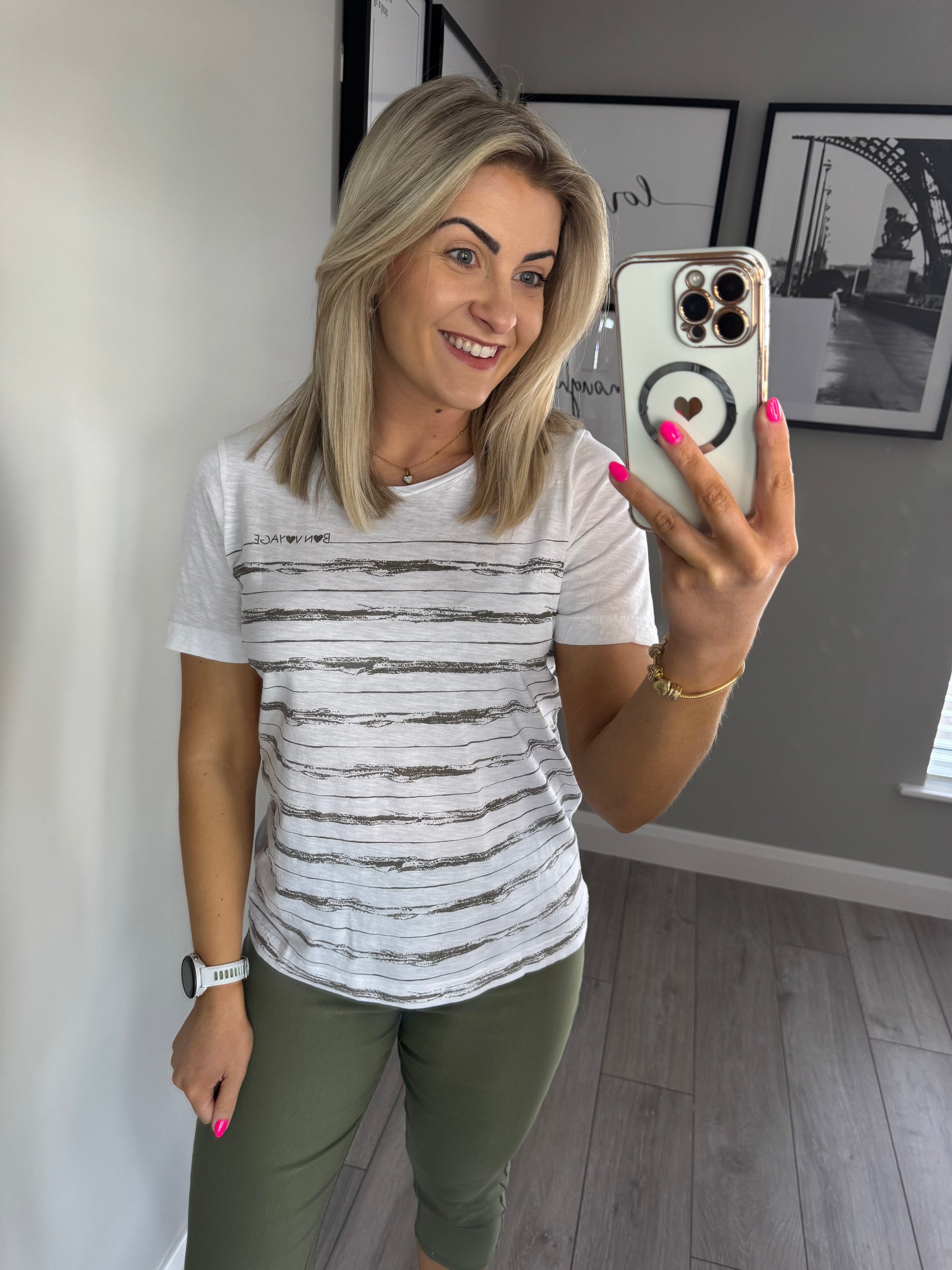 Taupe/White Slogan/Stripe Tee