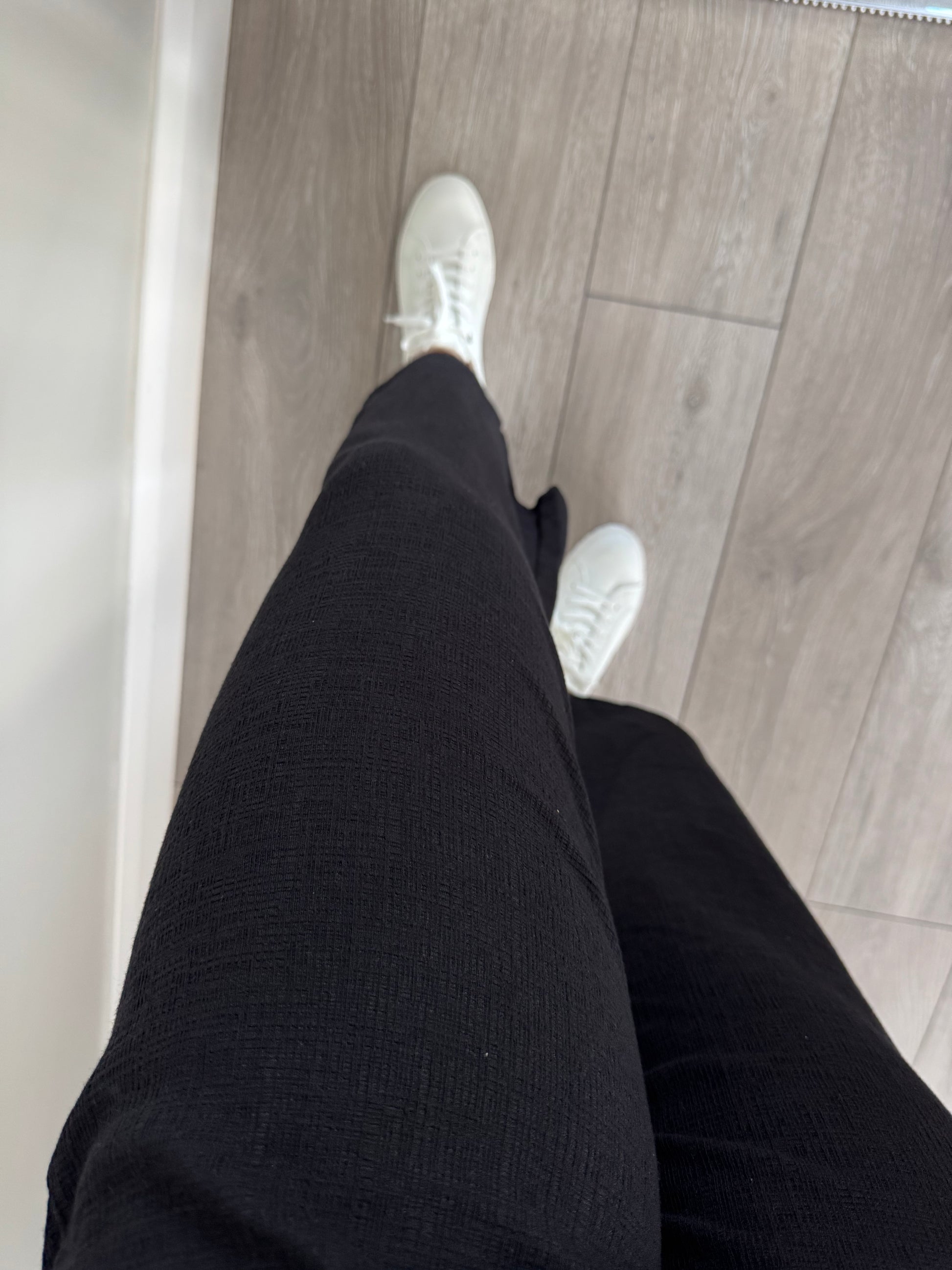 -Black pull on culotte style trousers with elasticated waist in cheese cloth fabric.