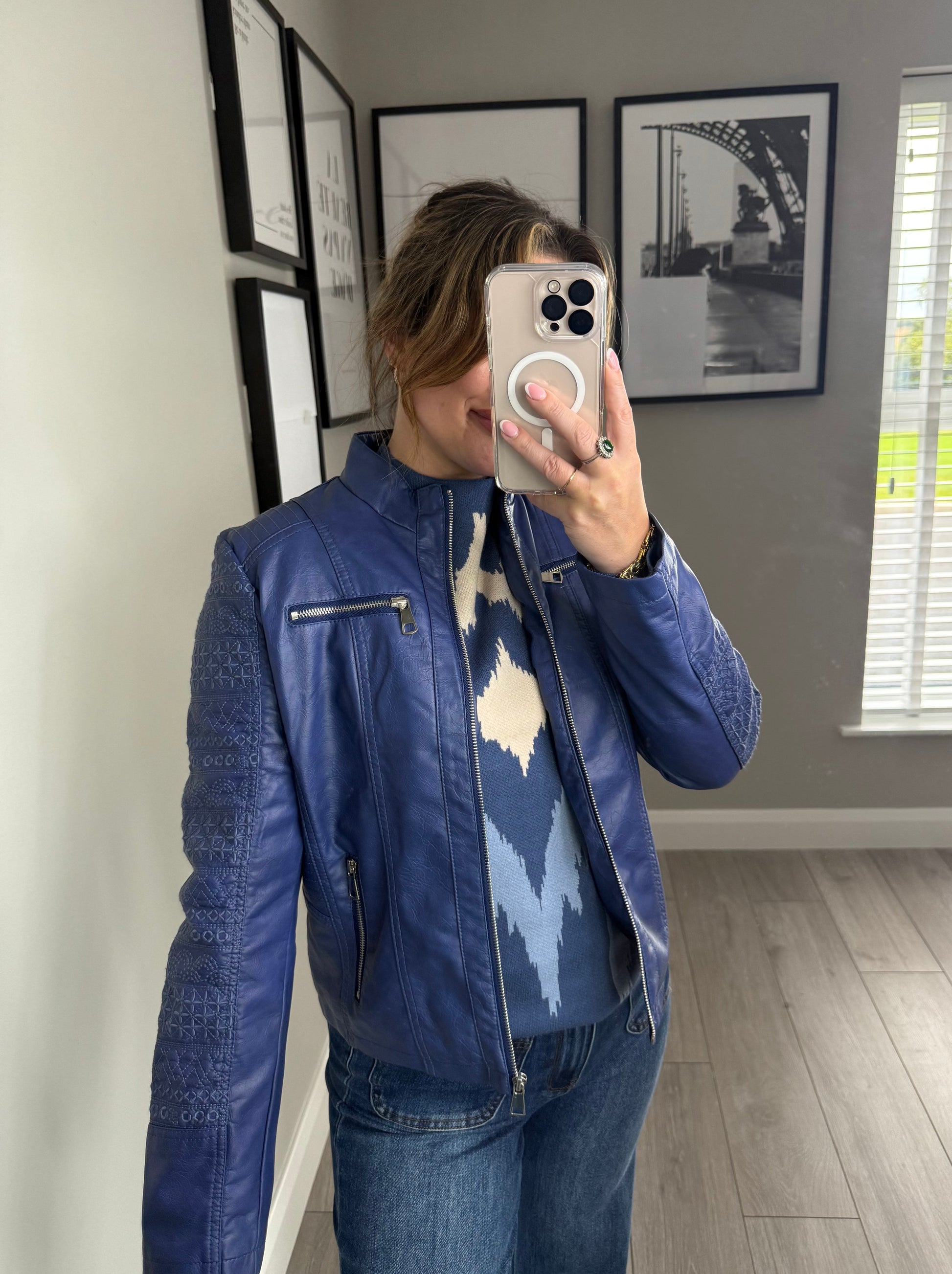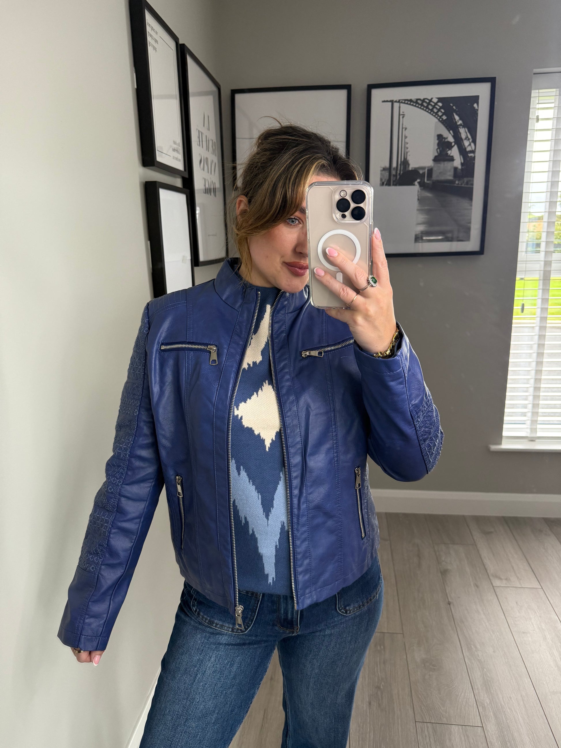 -Jessica Graaf cobalt blue faux leather jacket with silver hardware & laser cut detailing to the sleeves.