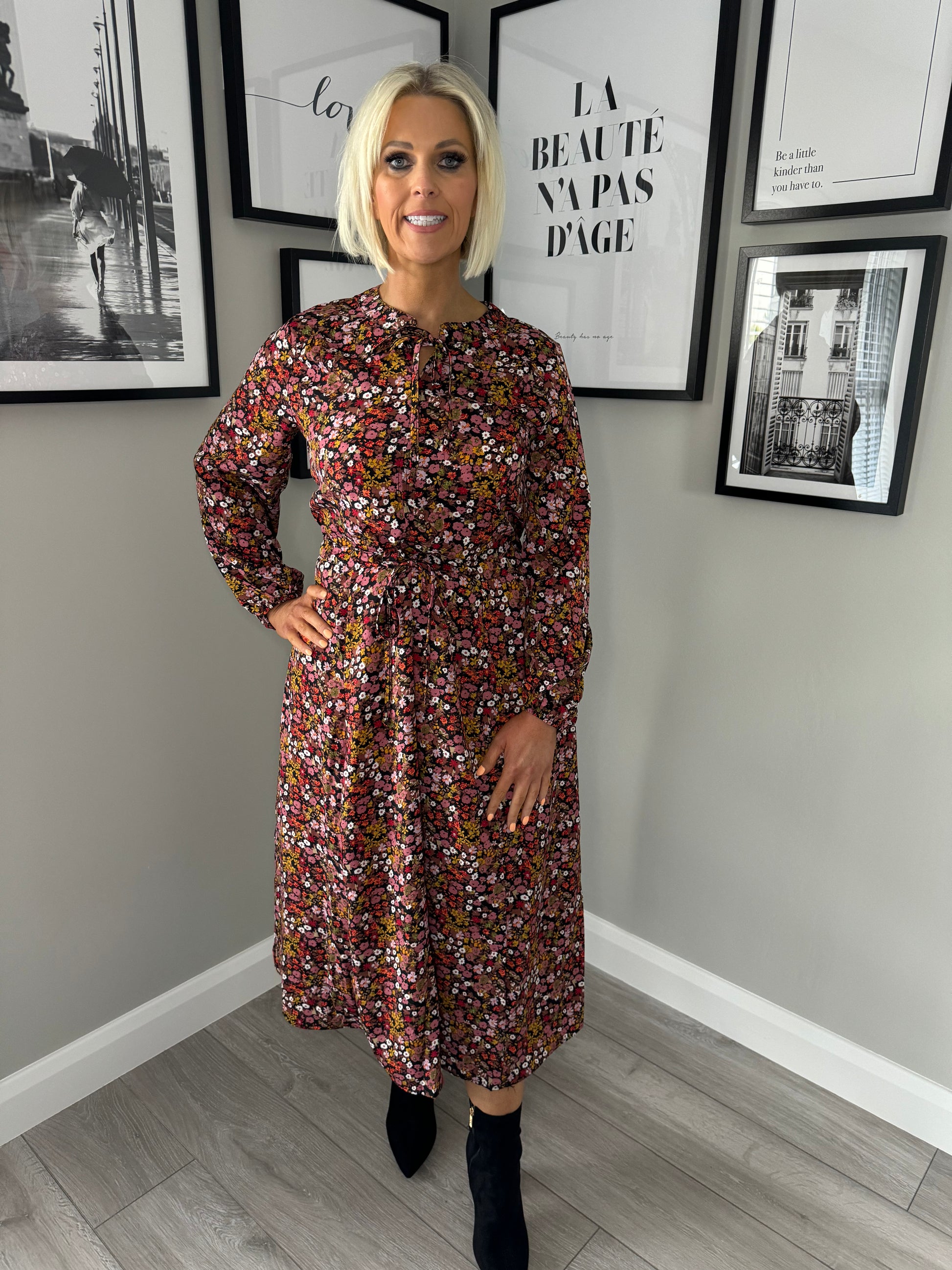 -Mudflower multi ditsy floral printed dress, with grandad style tie neckline, drawstring tie to the waist & full length cuffed sleeves