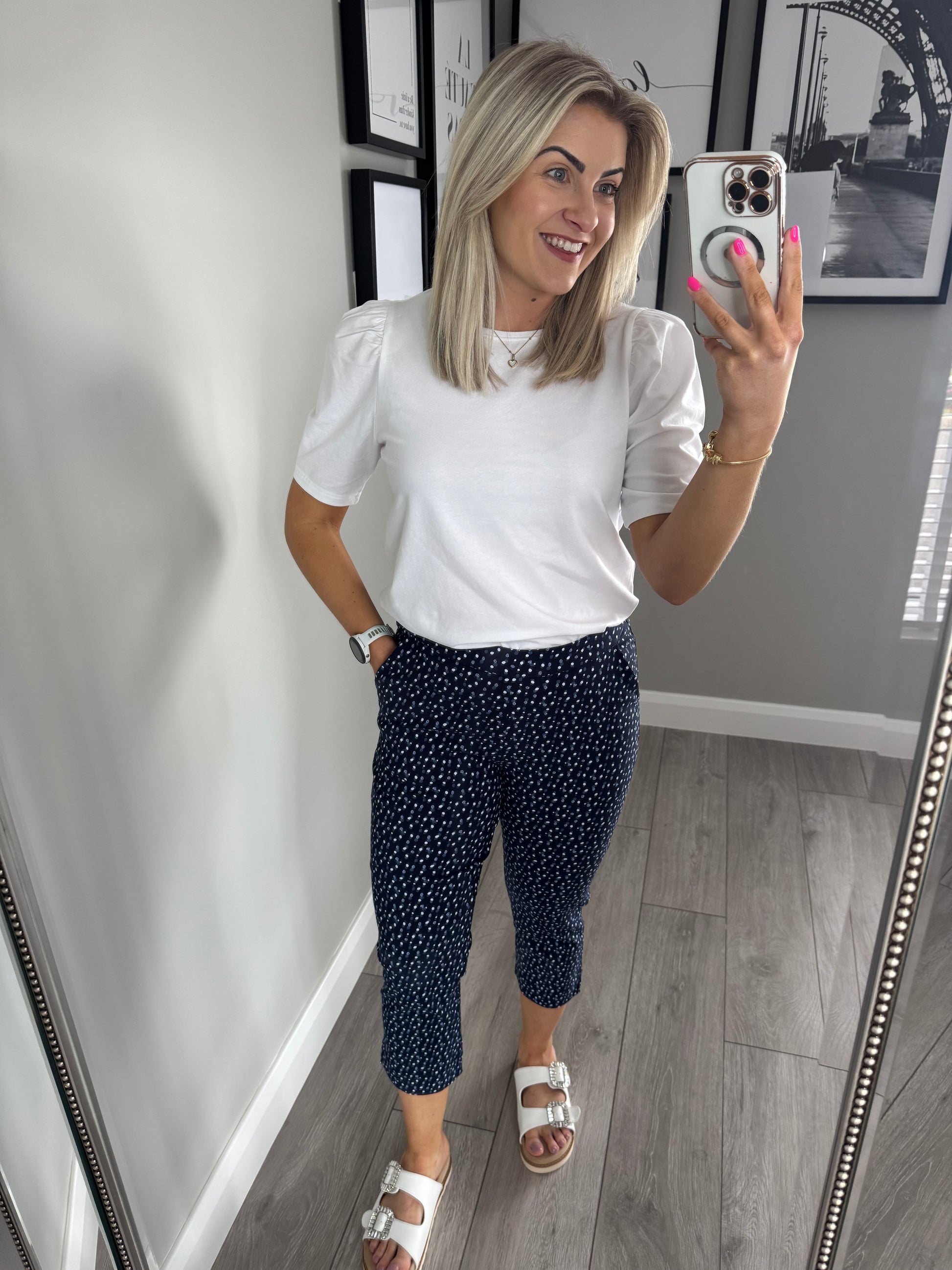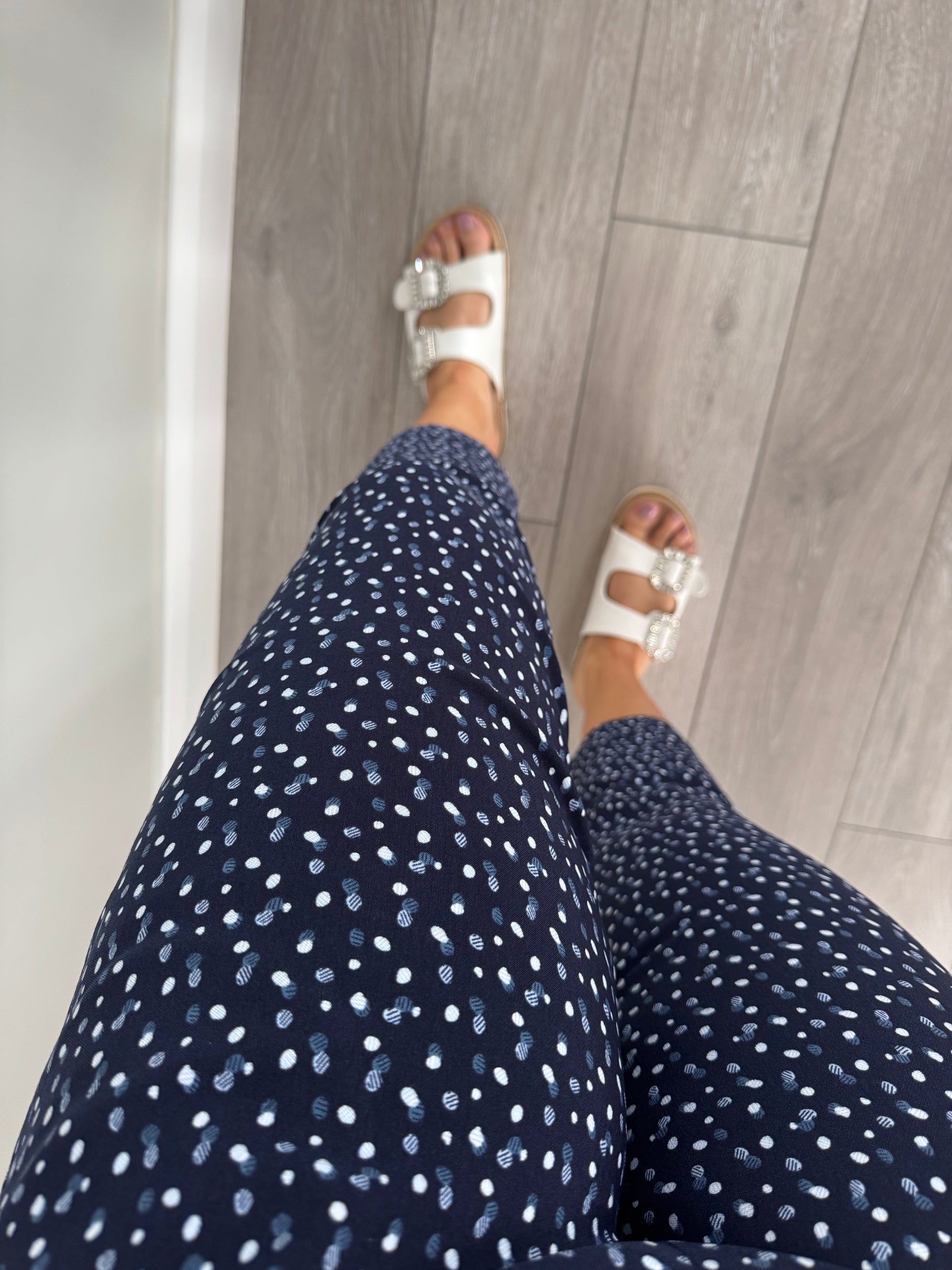 Claudia bengaline crops (three quarter length) in navy with denim & white speckled design. Split hem detail, full elasticated pull up waist with slim leg fit, stretch fabric for extra comfort.
