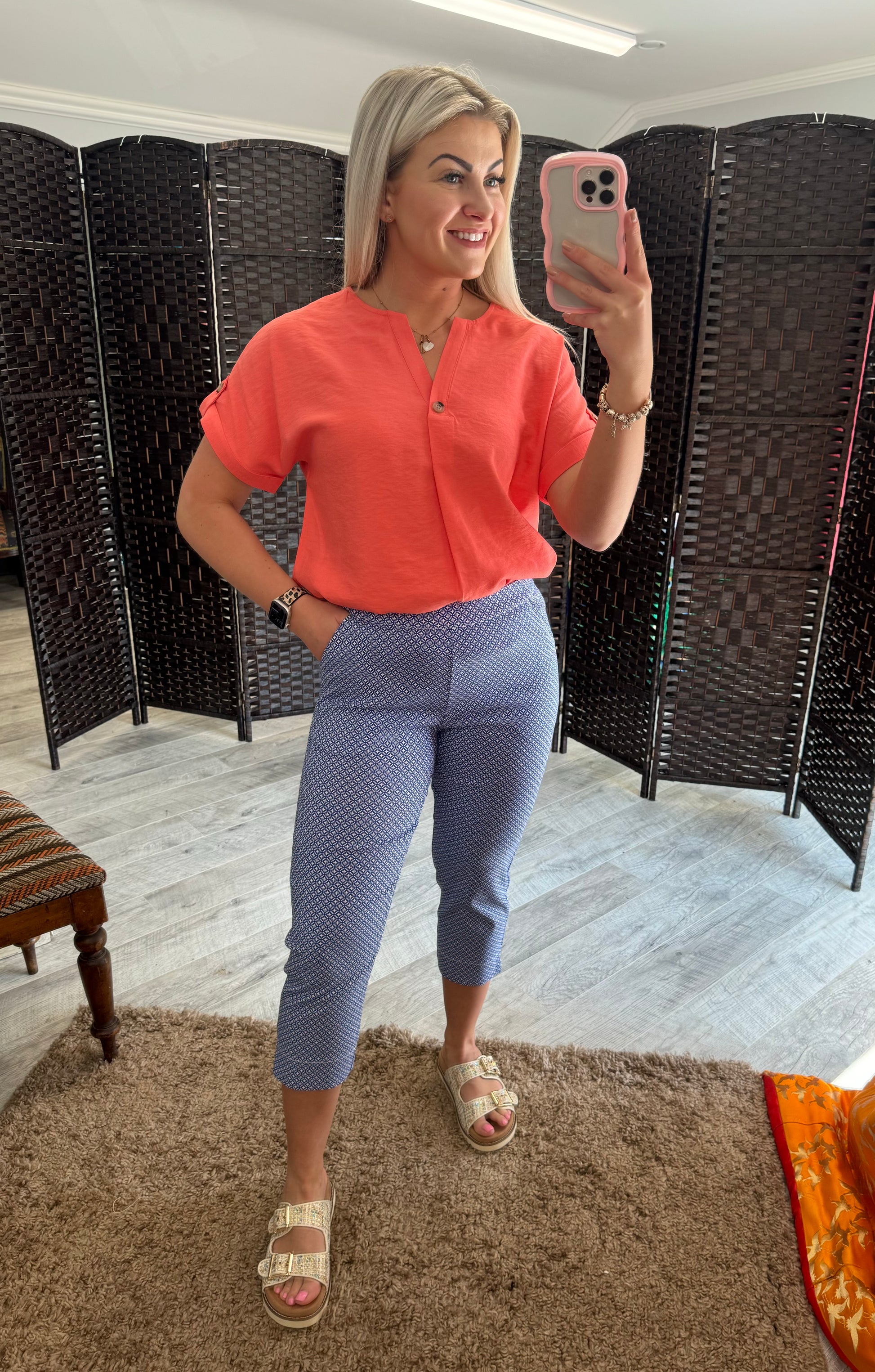 Claudia bengaline crops (three quarter length) in two toned royal & white with split hem detail, full elasticated pull up waist with slim leg fit, stretch fabric for extra comfort. True to size.