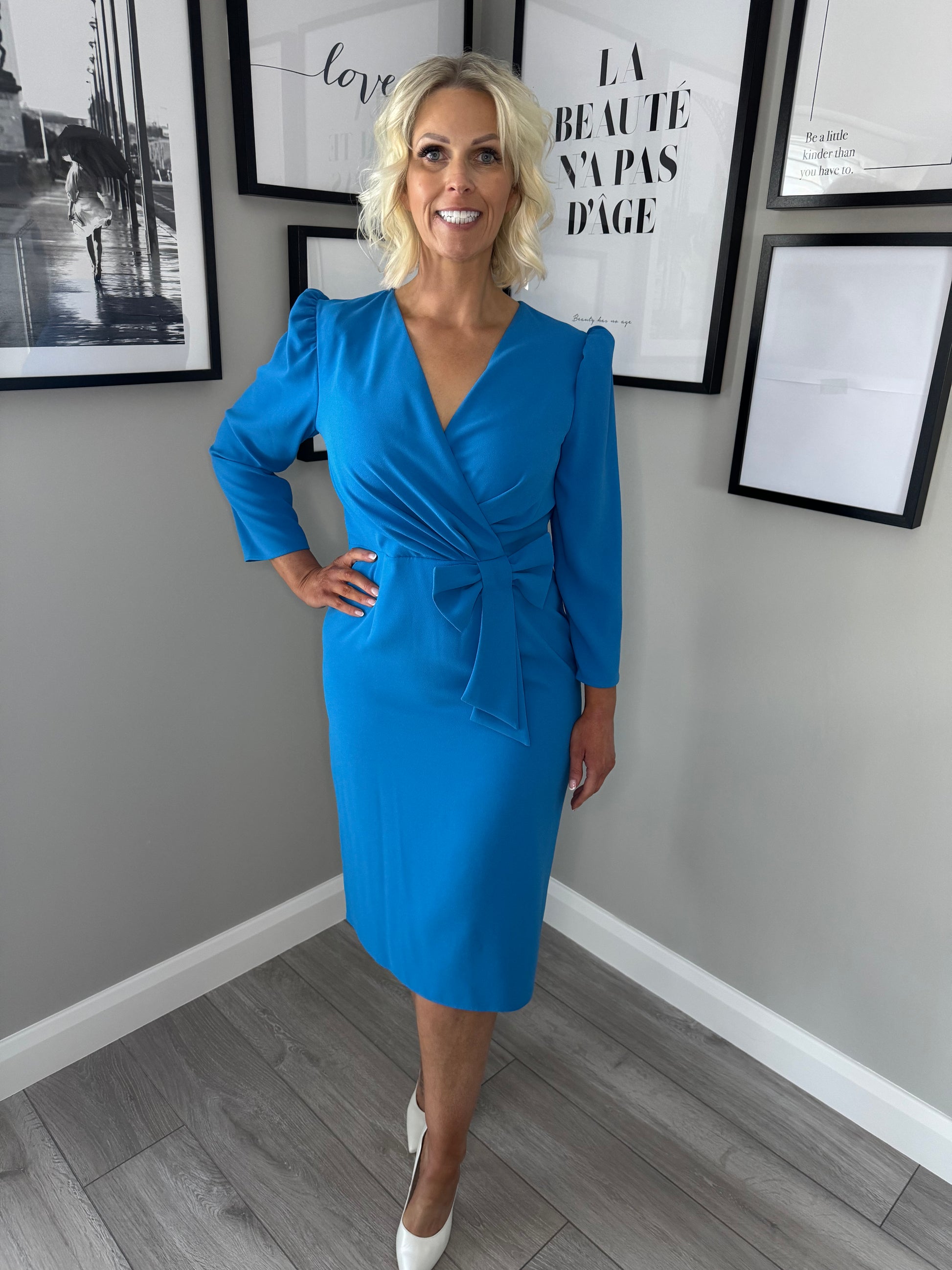 -Coco Doll blue dress with three quarter pleated sleeve and V neckline sweeping into ruched waistline with large bow detail.