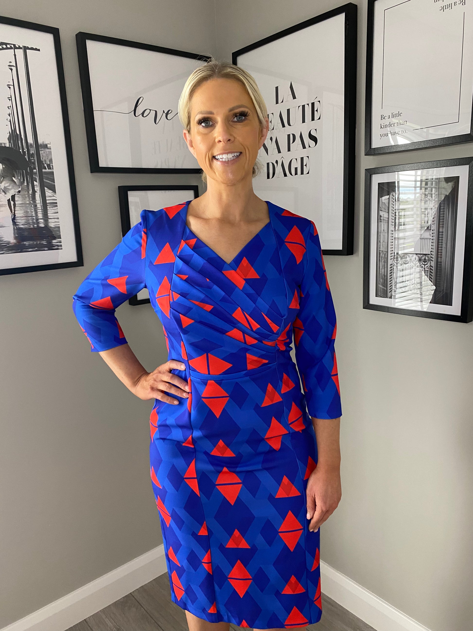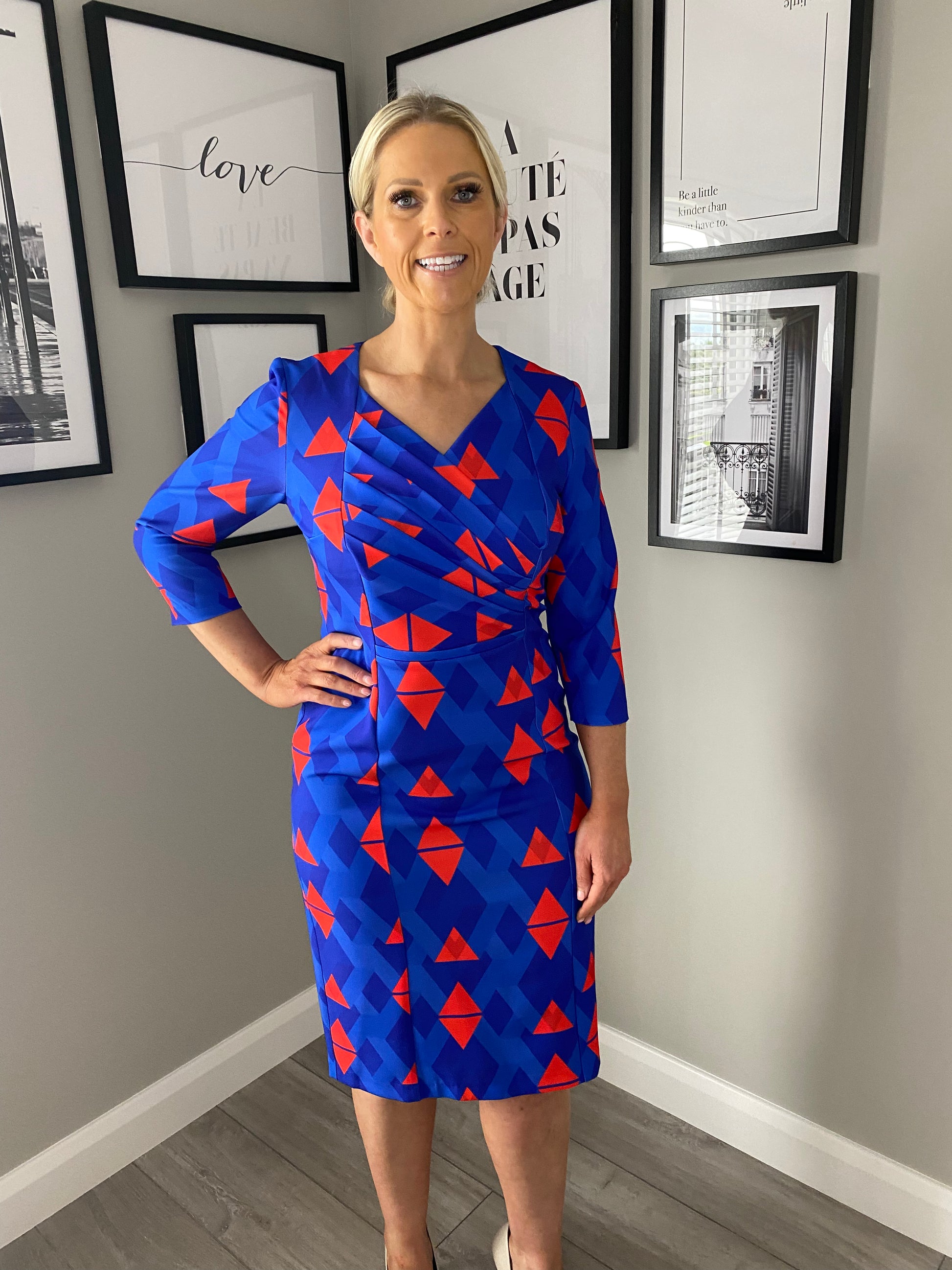 From the Coco Doll range we have this stunning royal dress with geometrical print in striking red. It's got three quarter length sleeves, layered effect bodice (very flattering) & V neckline before falling to midi length.