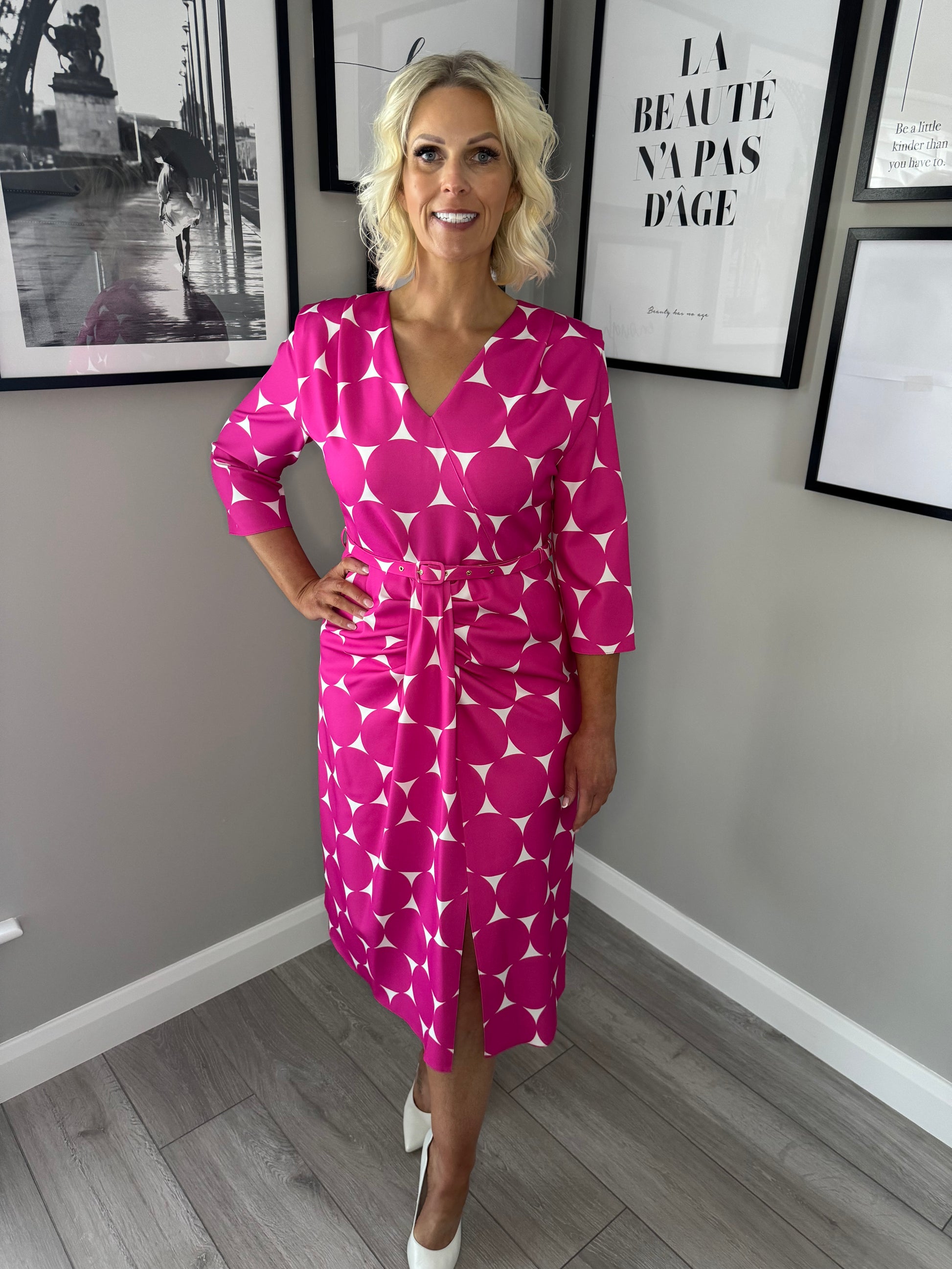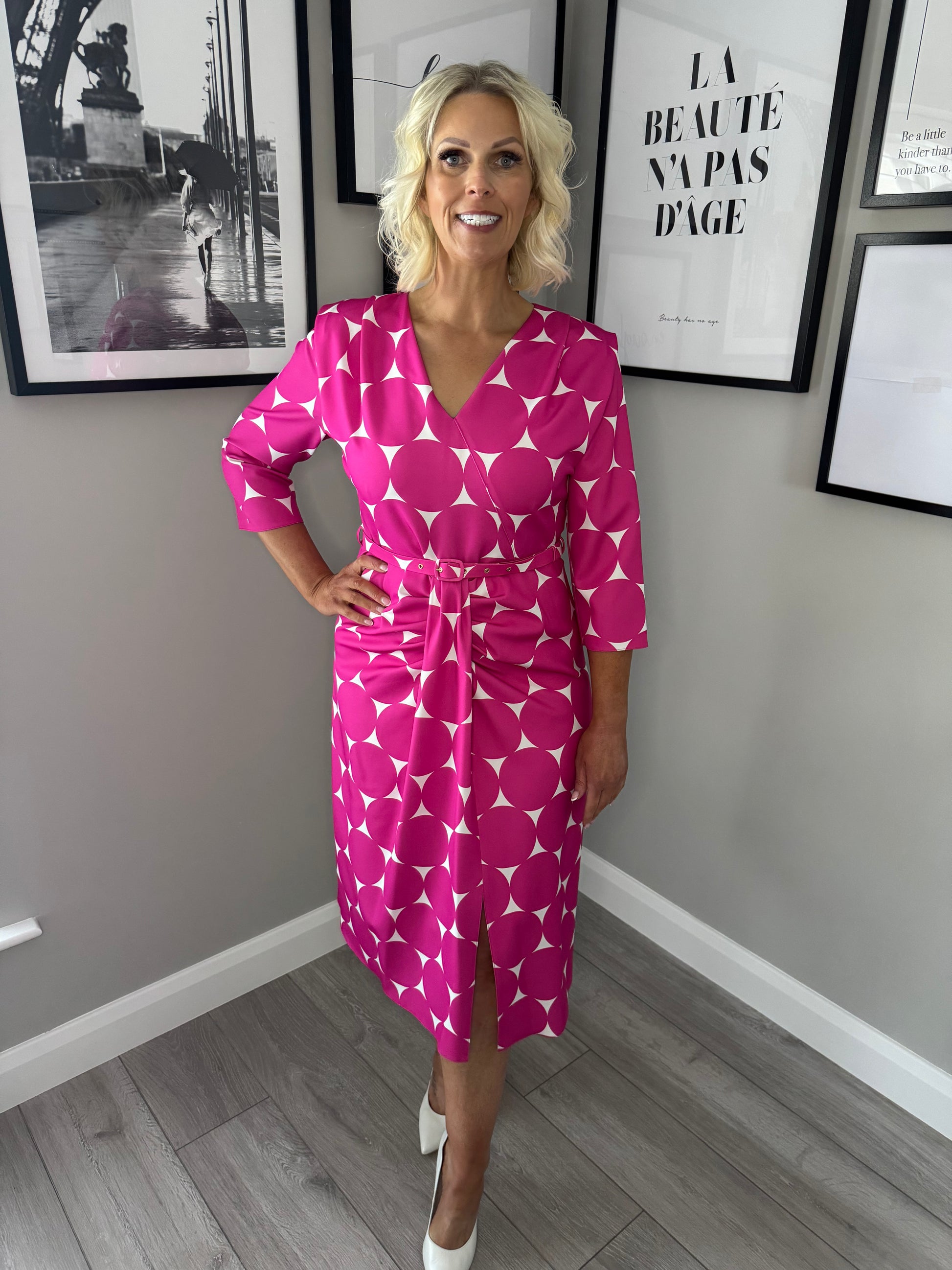 -Coco Doll fuchsia pink & off white printed dress with three quarter sleeve, matching belt & waterfall skirt effect.