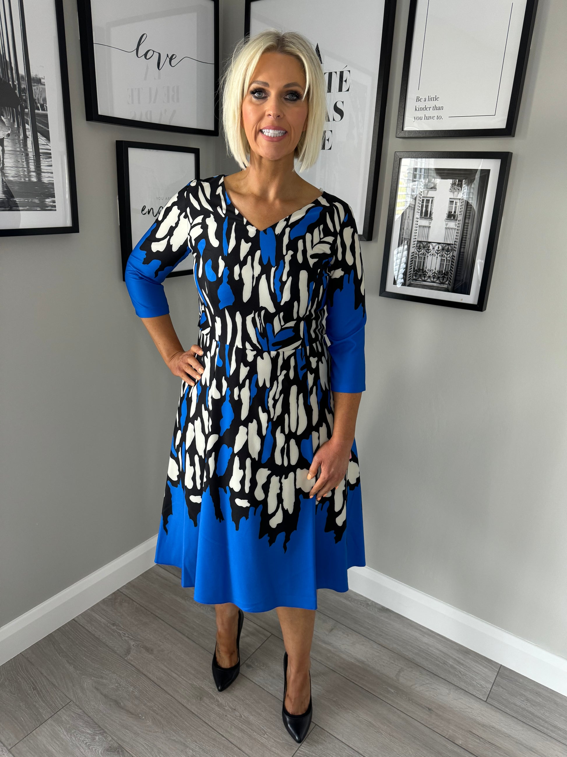 -Coco Doll royal blue, cream & black abstract print dress. With V neck & three quarter length sleeves its got a lightly flared skirt before finishing below the knee.
