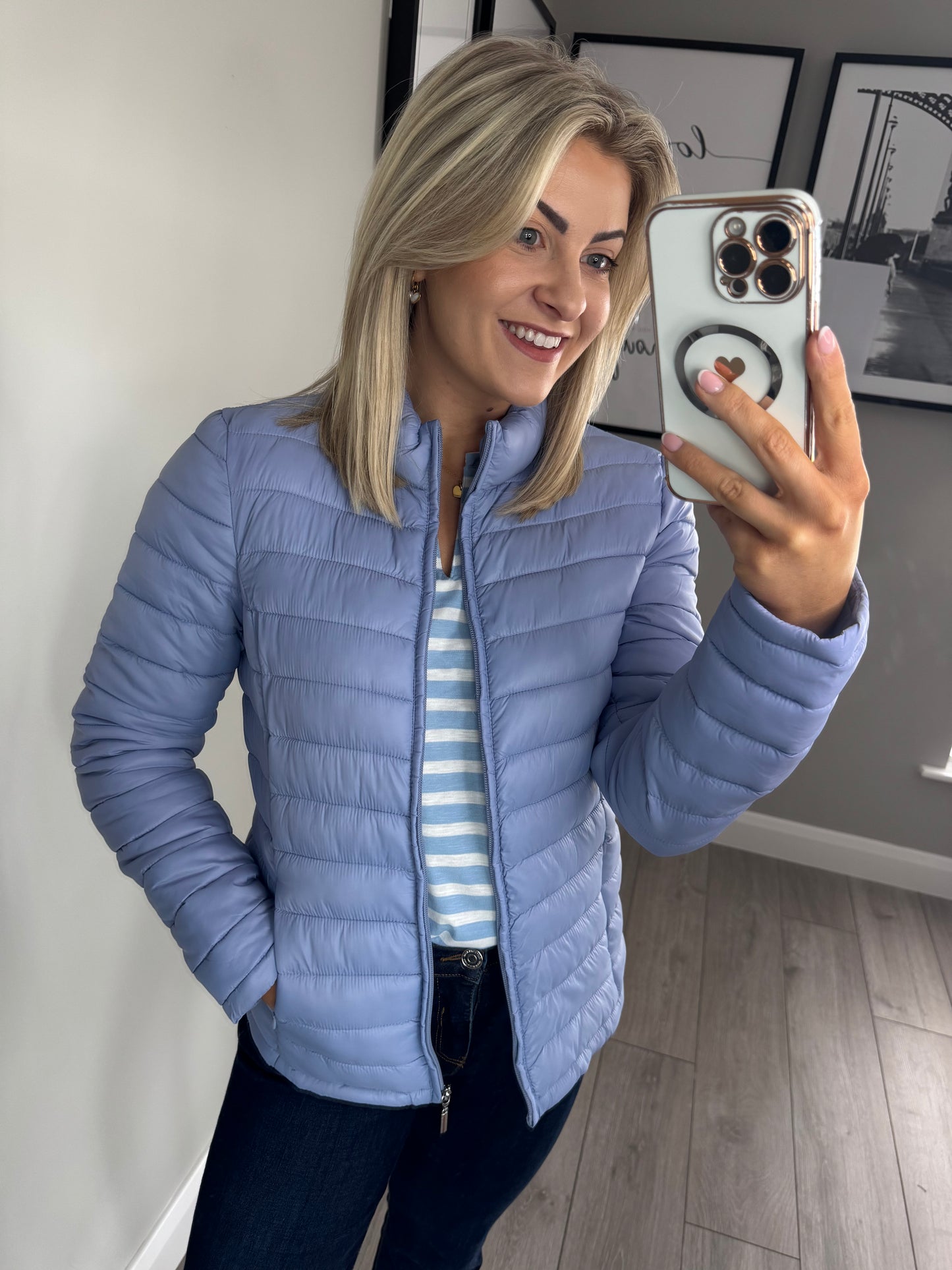 -Classic short puffer style anorak with zip through & double pockets in cornflour blue
