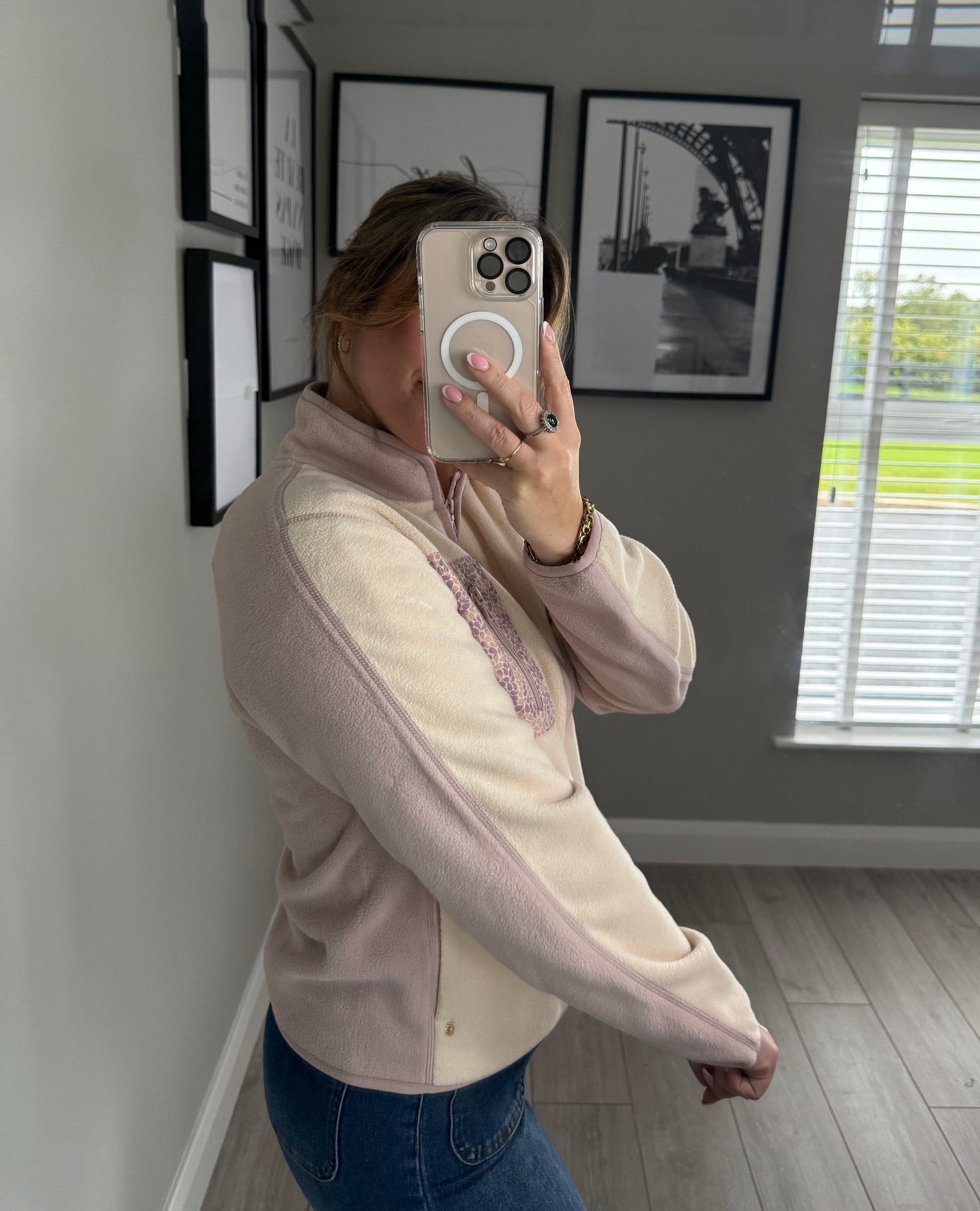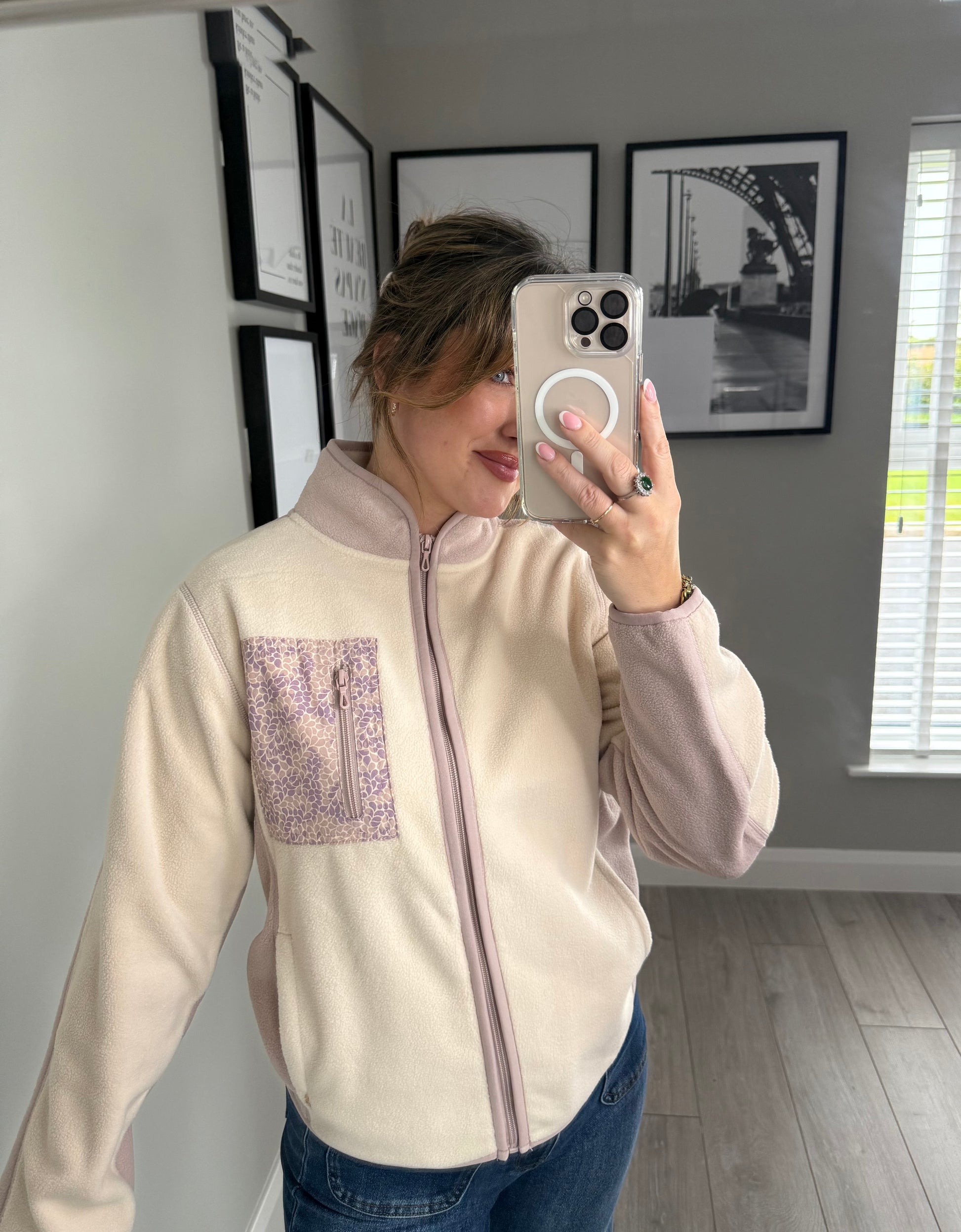-Jessica Graaf two toned soft touch zip up fleece with side pockets. Cream front with blush back & floral design breast pocket.