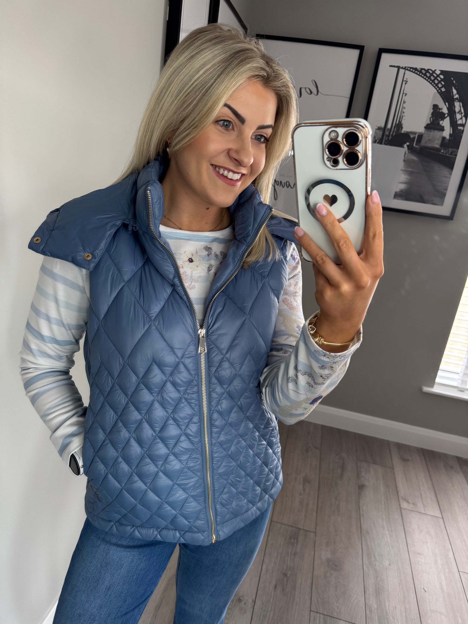 -Jessica Graff blue/denim quilted short gilet with large detachable hood, double pockets & zip through
