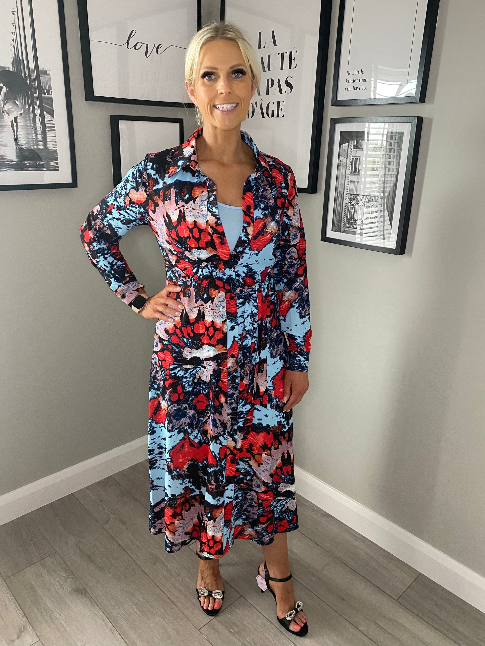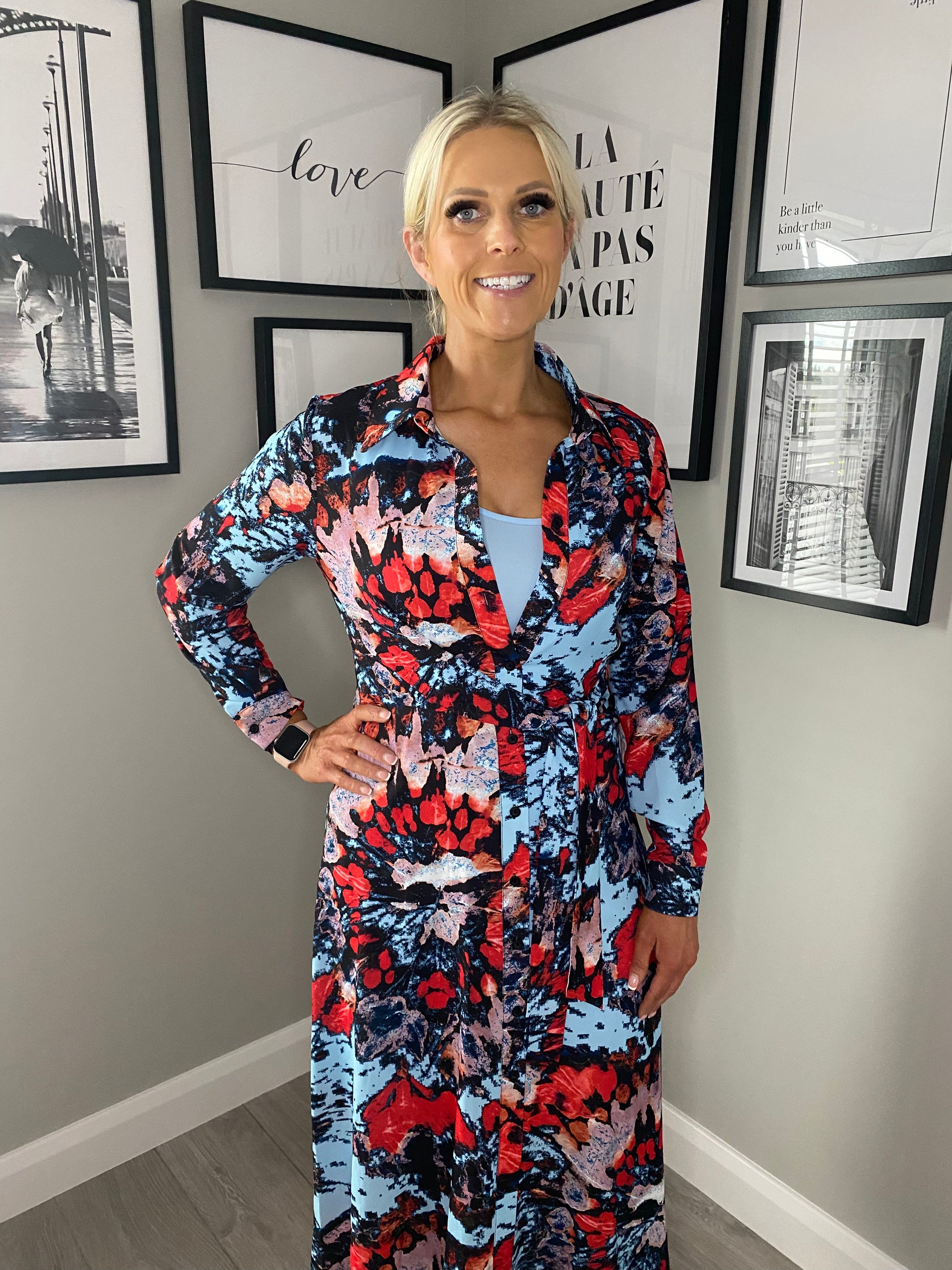 From the Ella Boo range we have this striking shirt dress! In shirt dress style it combines a stunning aqua blue, black & red with aqua blue vest (dress length) layered underneath to pop the blue. It's got typical shirt collar & full length sleeves as well as buttons from collar to bottom.