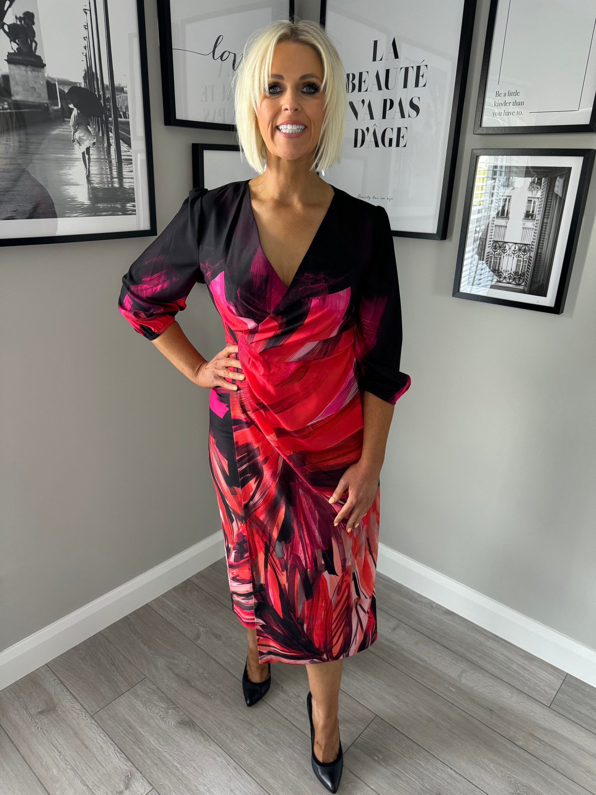 -Ella Boo abstract print dress in black & red. With wrap over effect, V neckline & three quarter length cuffed sleeves.