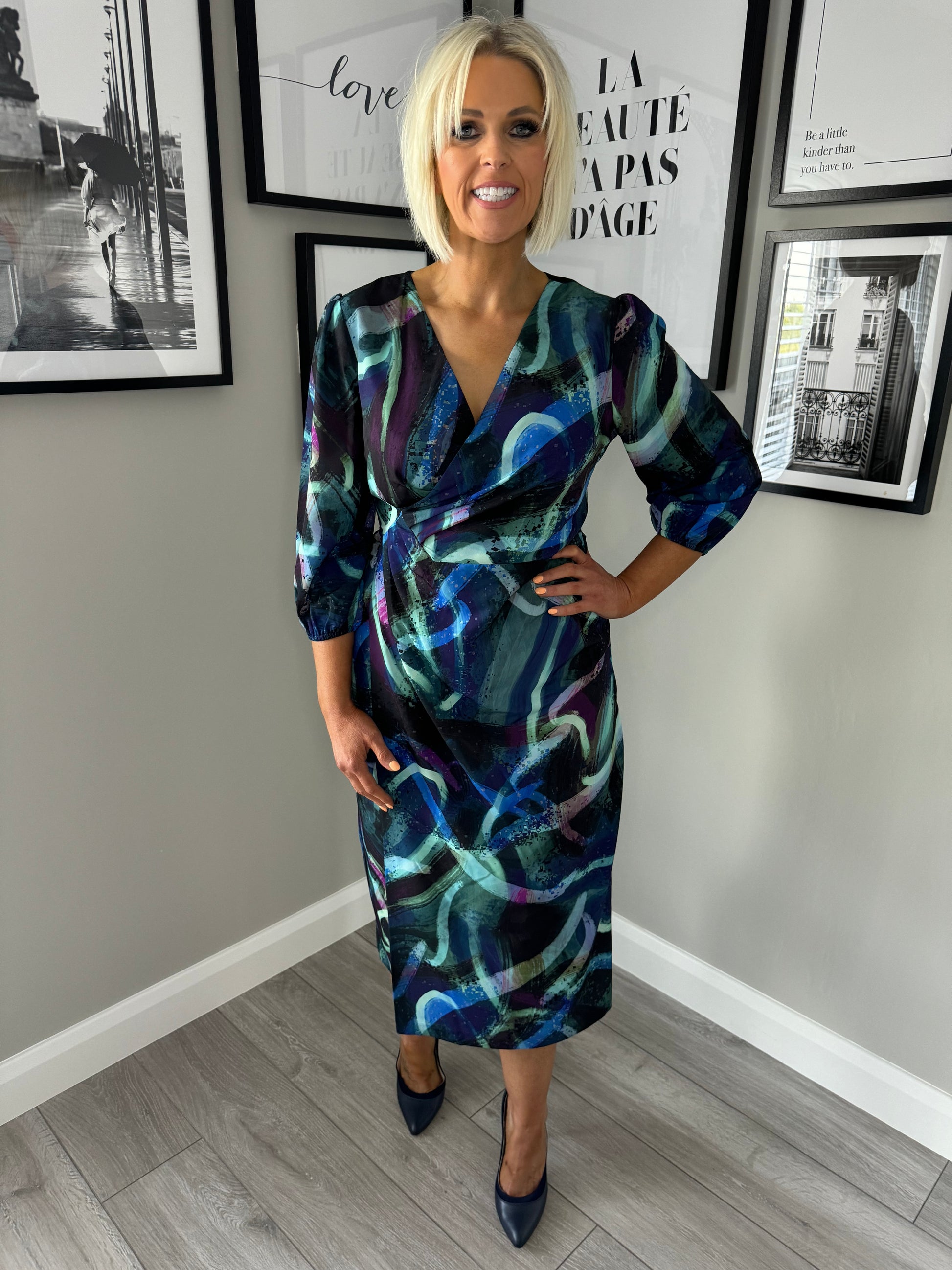 -Ella Boo blue multi abstract print dress (pinks, greens, royals). With wrap over effect, V neckline & three quarter length cuffed sleeves.