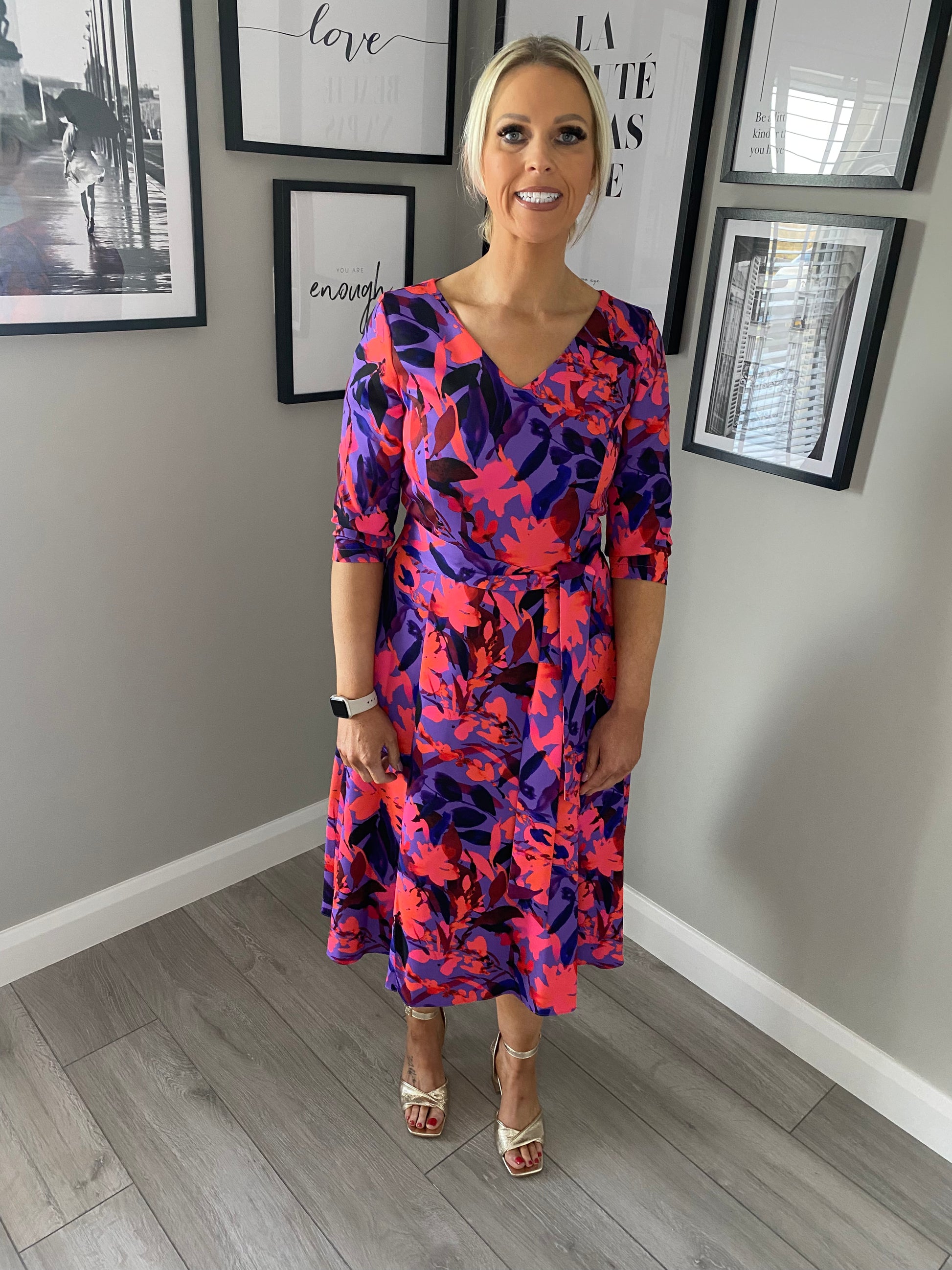 From the Coco Doll range this one is the most unusual colour blends! On a violet/soft purple base this ones got a floral design combining a orangey pink with navy/blacks. It's got a half sleeve, V neckline & lightly flared skirt with matching waisted belt for the most feminine of looks. We styled with our gold Casey sandals.