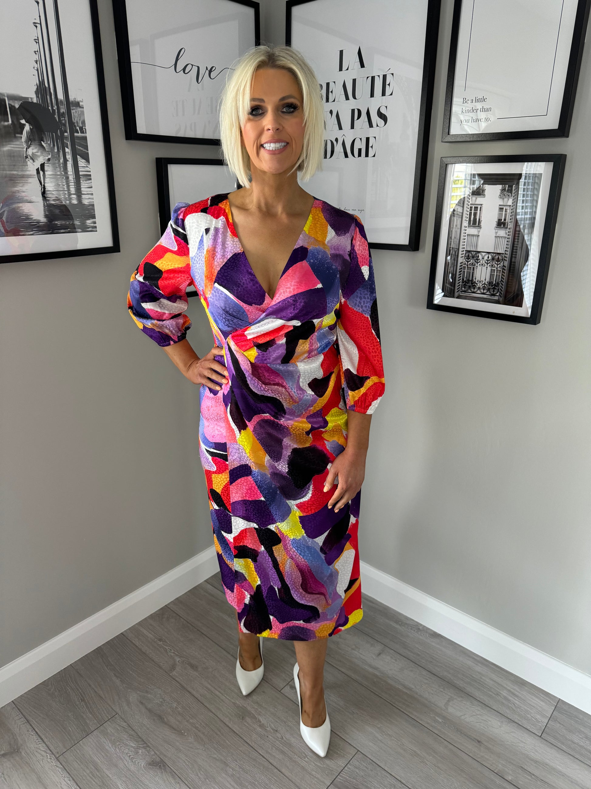 -Ella Boo multi abstract print dress (pink, purples, red, white, black). With wrap over effect, V neckline & three quarter length cuffed sleeves.