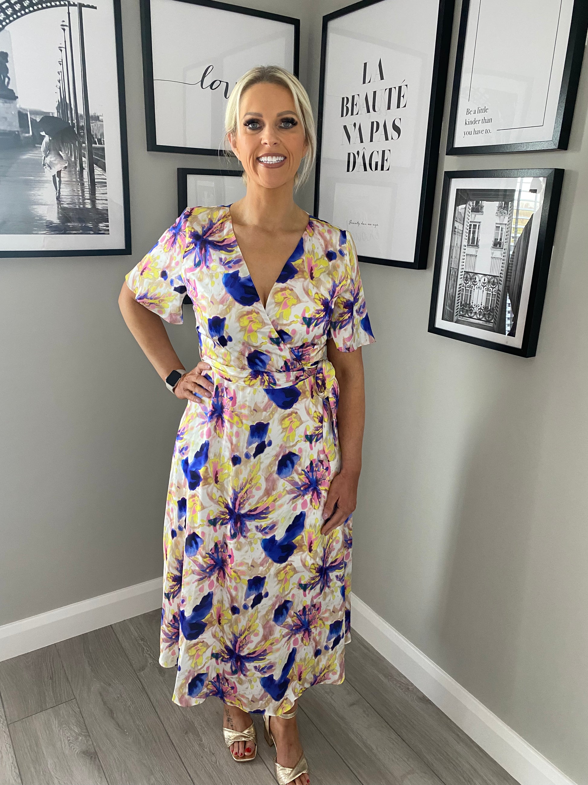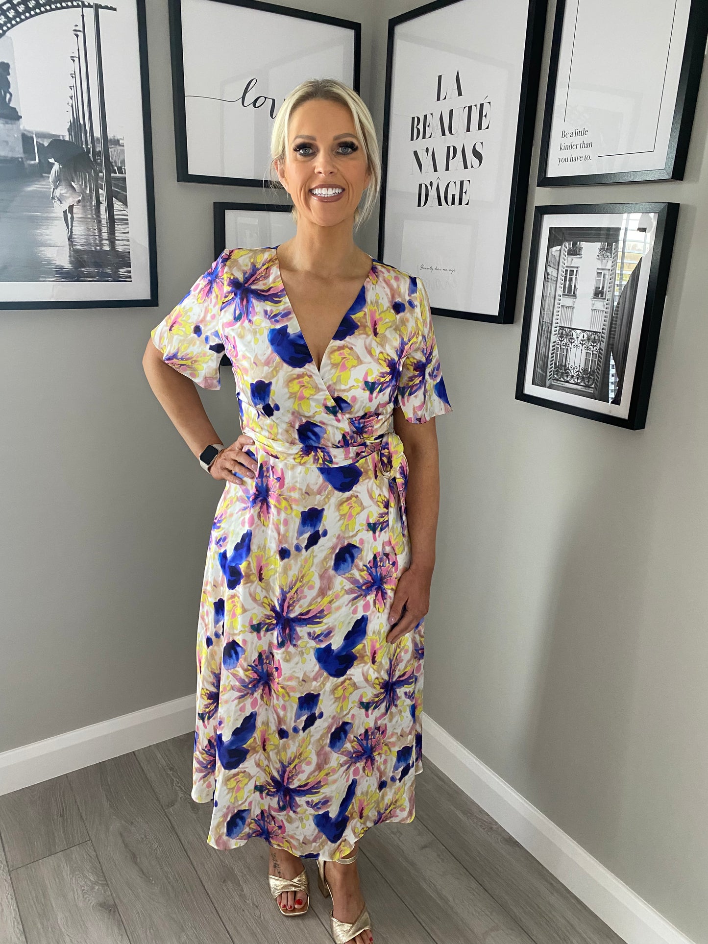 From the Ella Boo range we have this pink, taupe & royal printed dress. It's a wrap style with waterfall sleeves & waisted belt tying for a feminine finish. It's crafted from a light luxurious silk making it comfortable. We've styled with our Casey gold sandals to pull out the taupe shades.