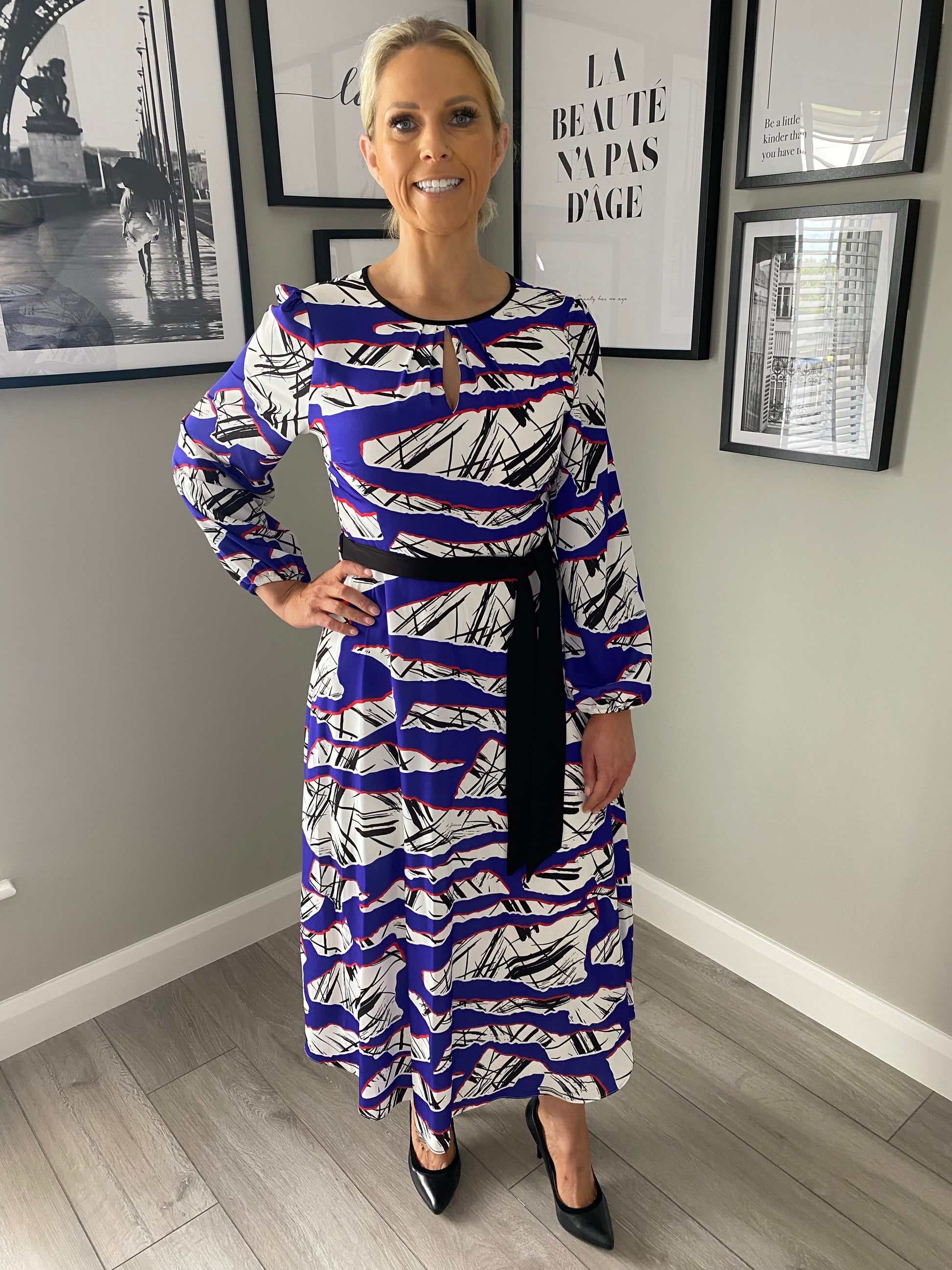 From the Ella Boo range we have this uniquely coloured print dress. It's in a deep purple with monochrome (black & white) print throughout & trimmed in red. It's got a keyhole neckline as well as full length cuffed sleeves & black waisted belt to clinch in the waist.