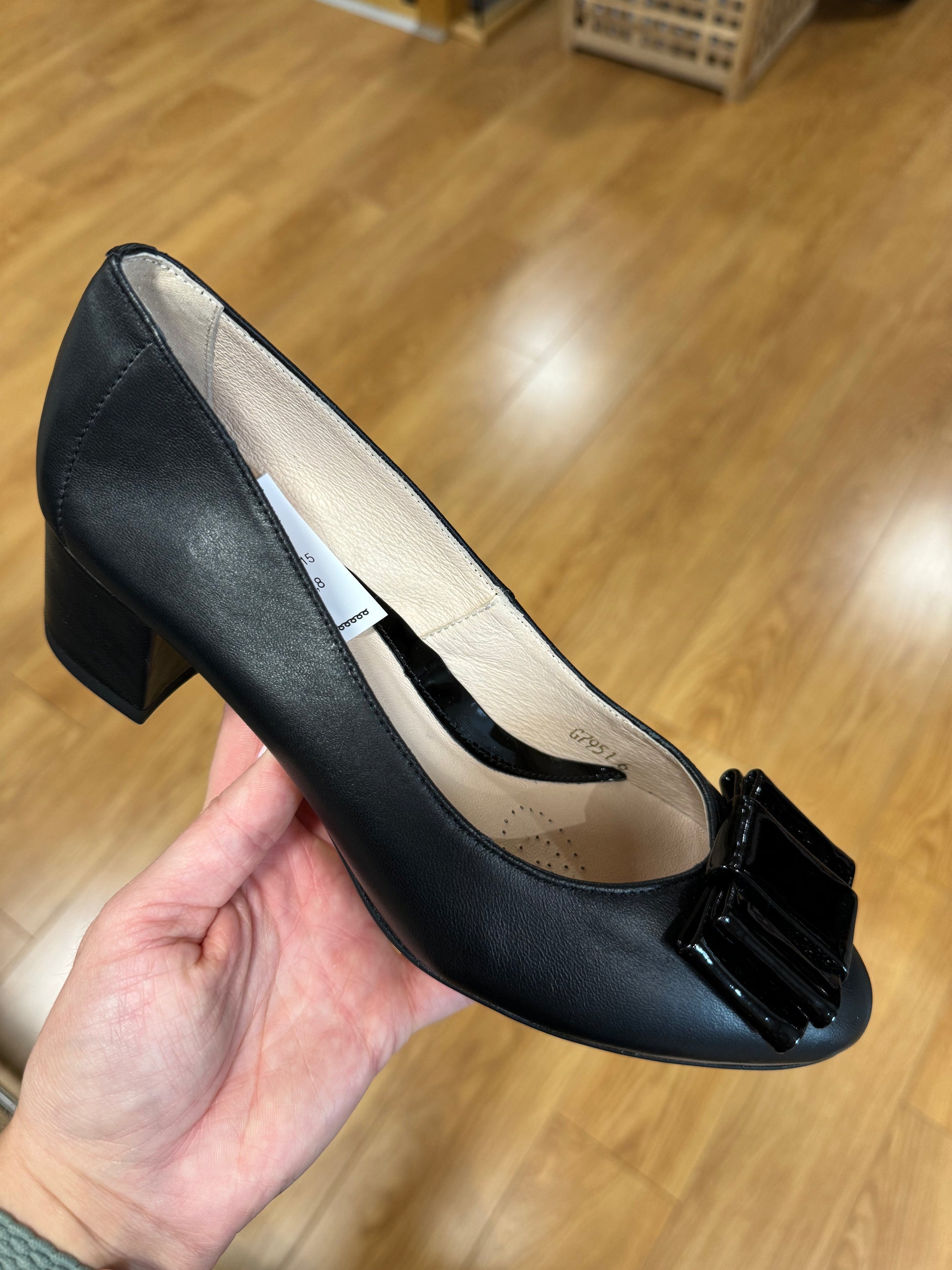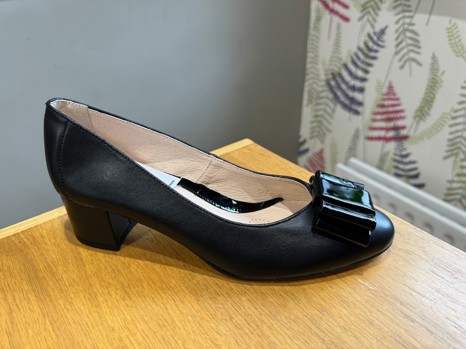 Emis Soft Leather Court Shoe in Leather Finish with Patent Bow Front & 1.75 inch Block Heel