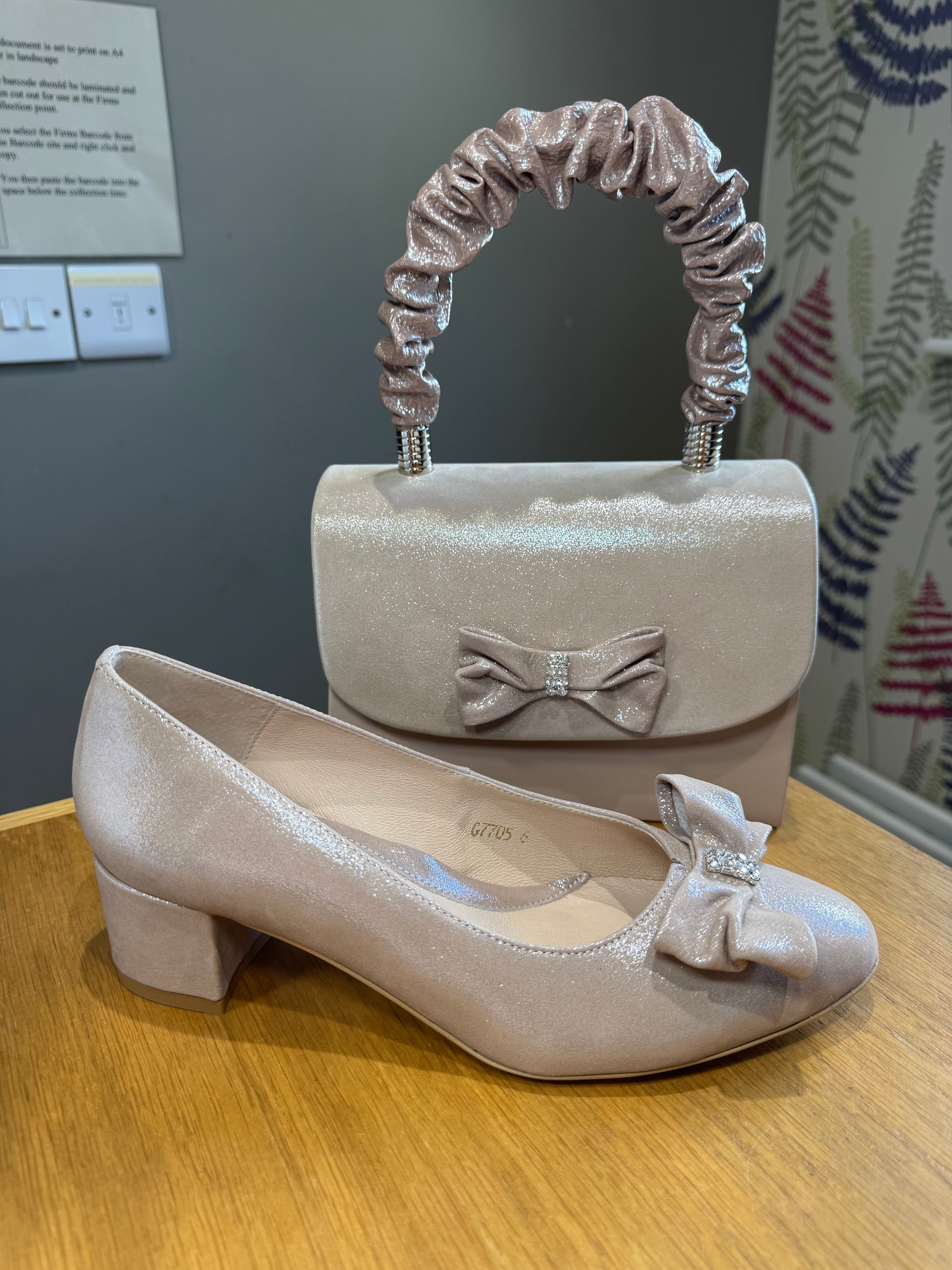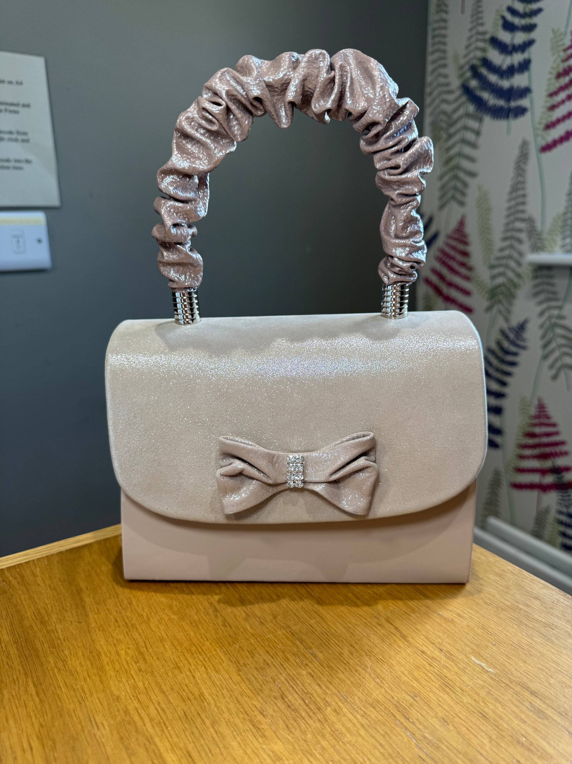 Emis Blush Shimmer Leather Box Bag with Small Scrunch Handle & Diamanté Bow Detail