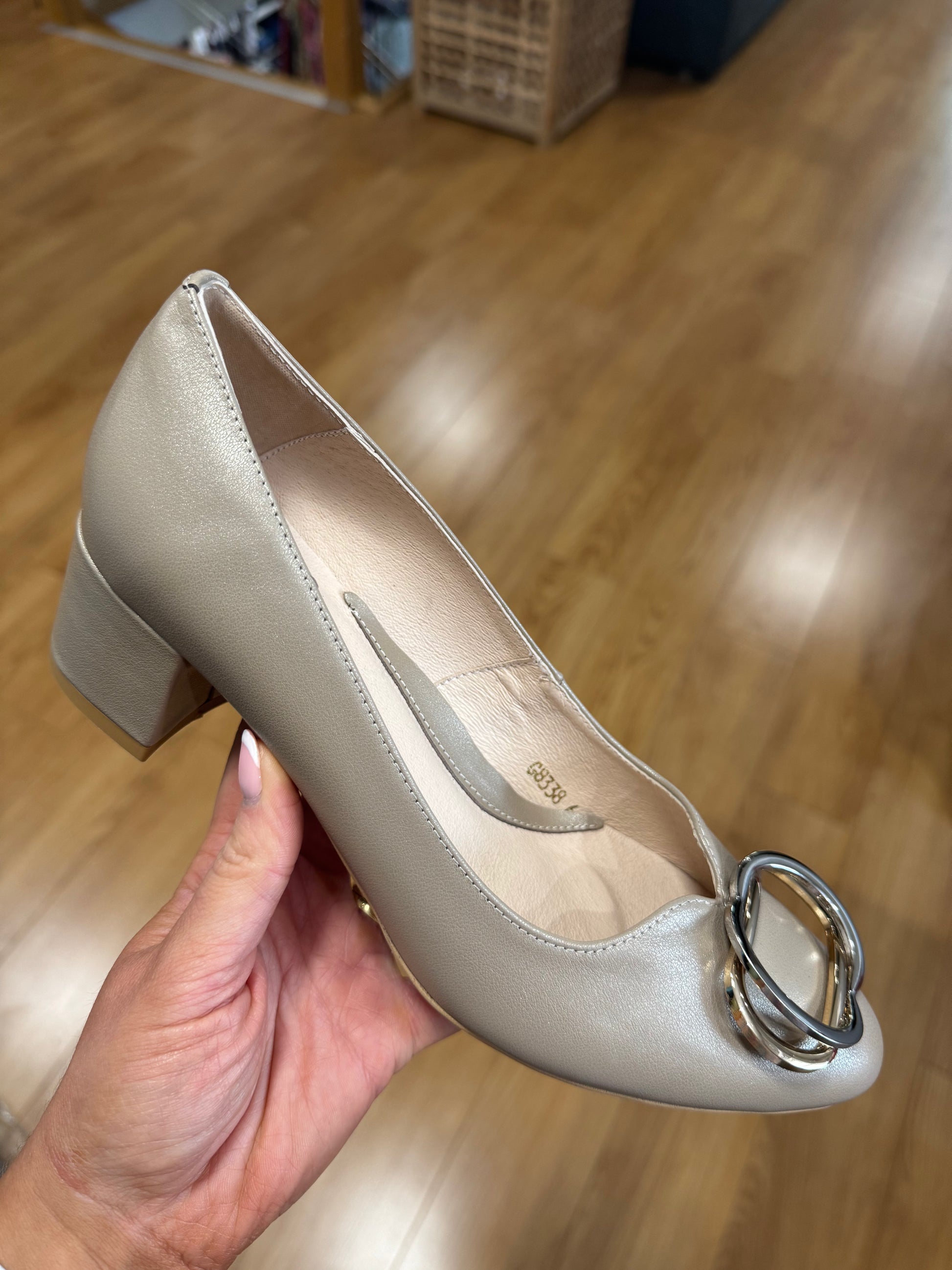 Emis Soft Leather Court Shoe with Block Heel & Two Toned Brooch Front