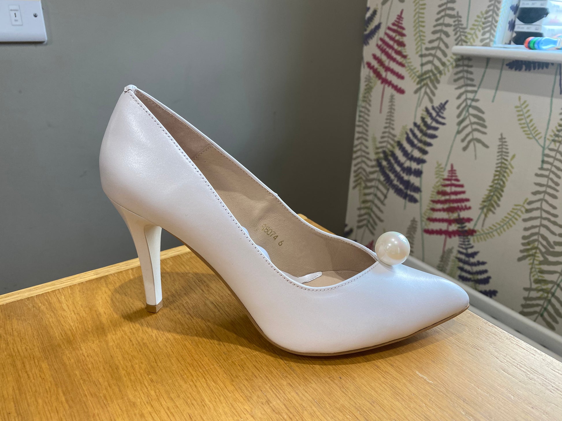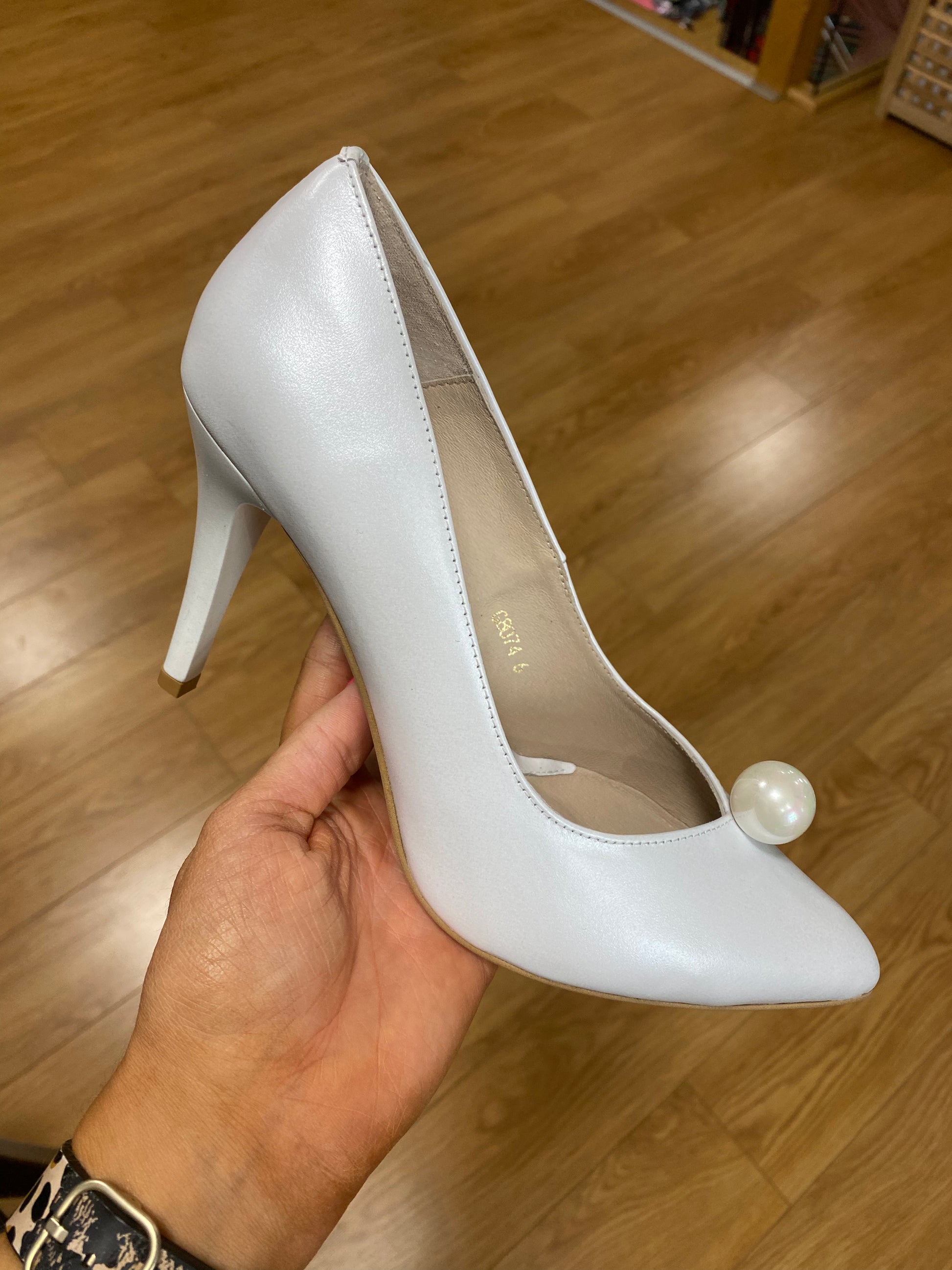 Emis Soft Leather Court Shoe with Soft Pearlised Finish, Pearl Attachment & 3.5 inch Heel