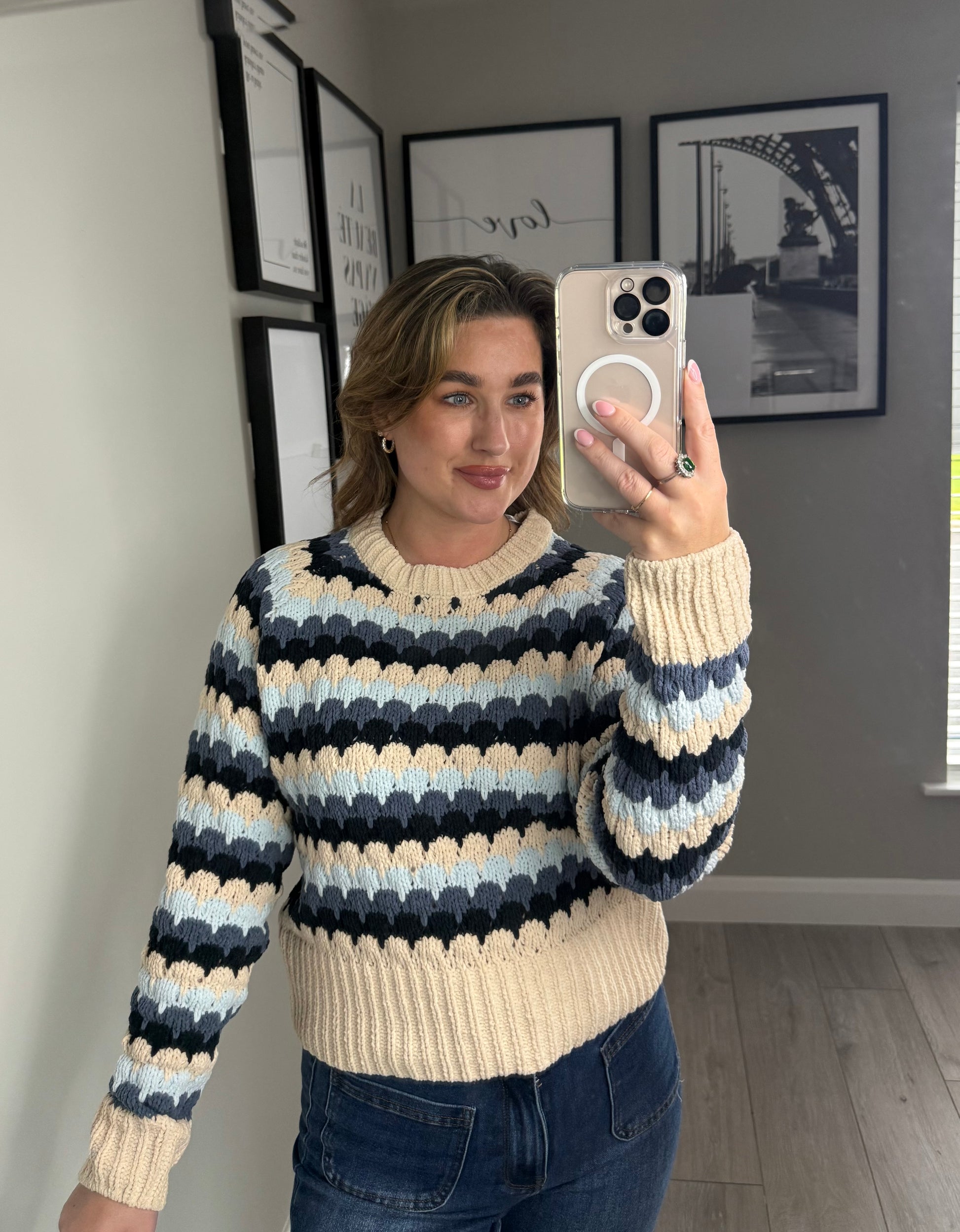 -Freequent four toned stripe effect knit jumper. Slightly cropped in beige, sky blue, denim blue & navy mix.