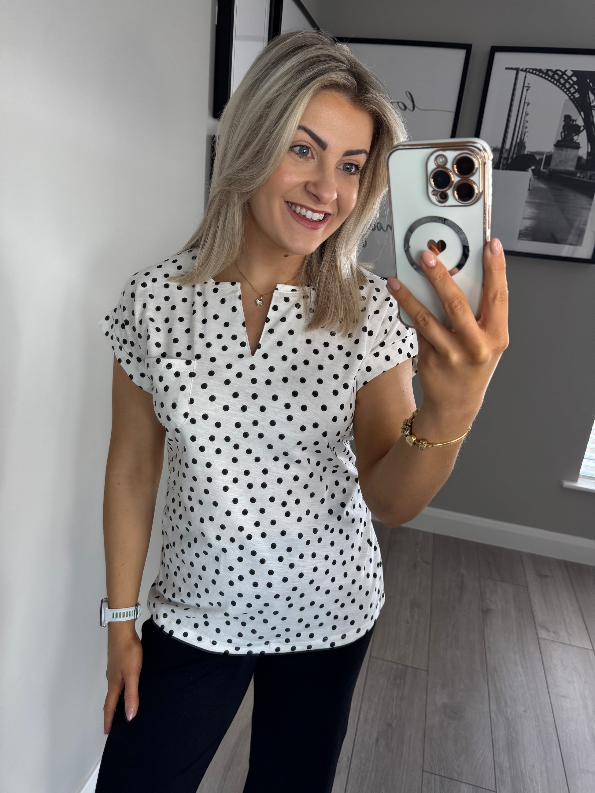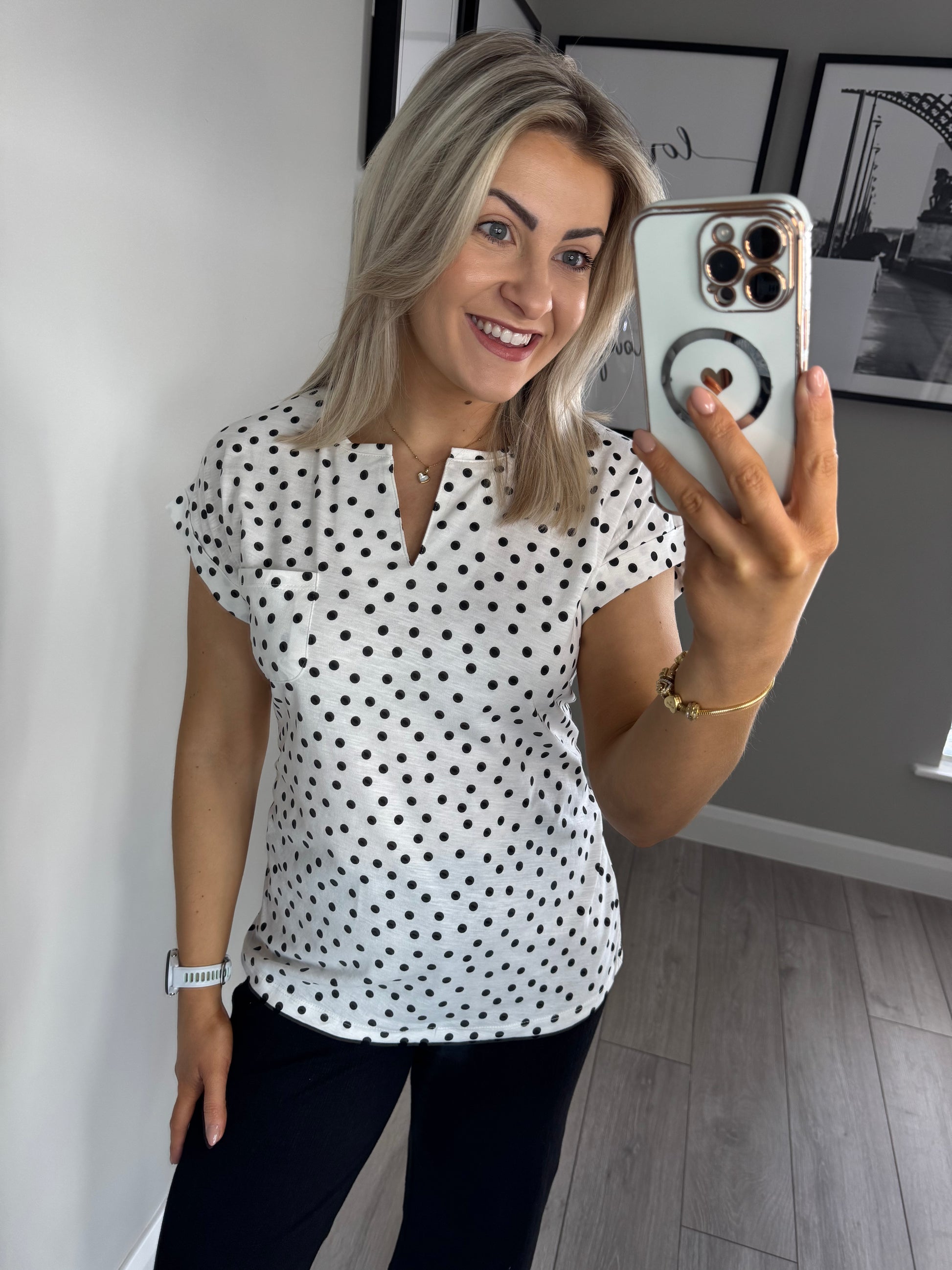 -Freequent two toned black & white spotted tee with left pocket detail.
