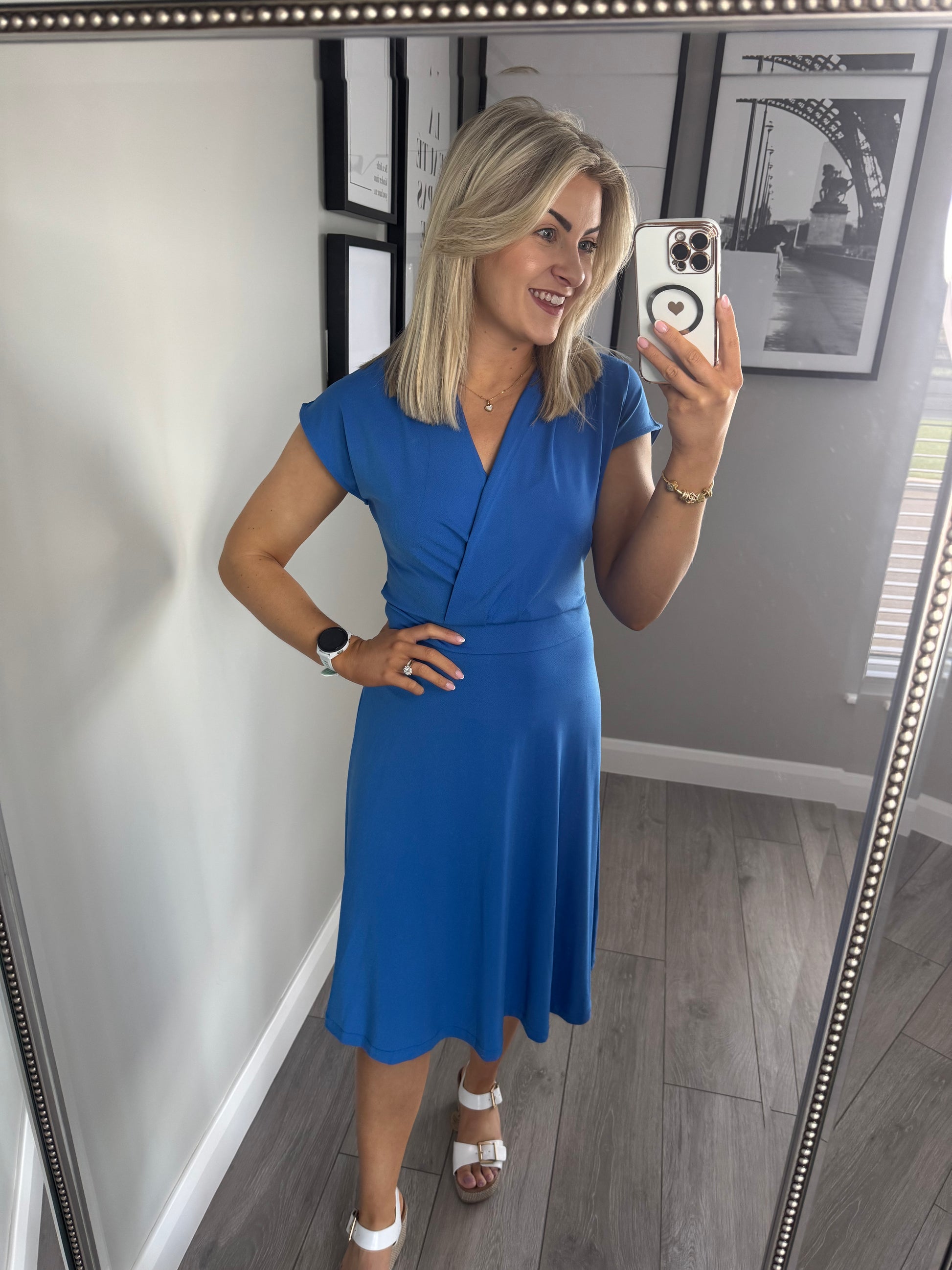 -Freequent blue dress with short cap sleeve, wrap over effect bodice & slight swing skirt.