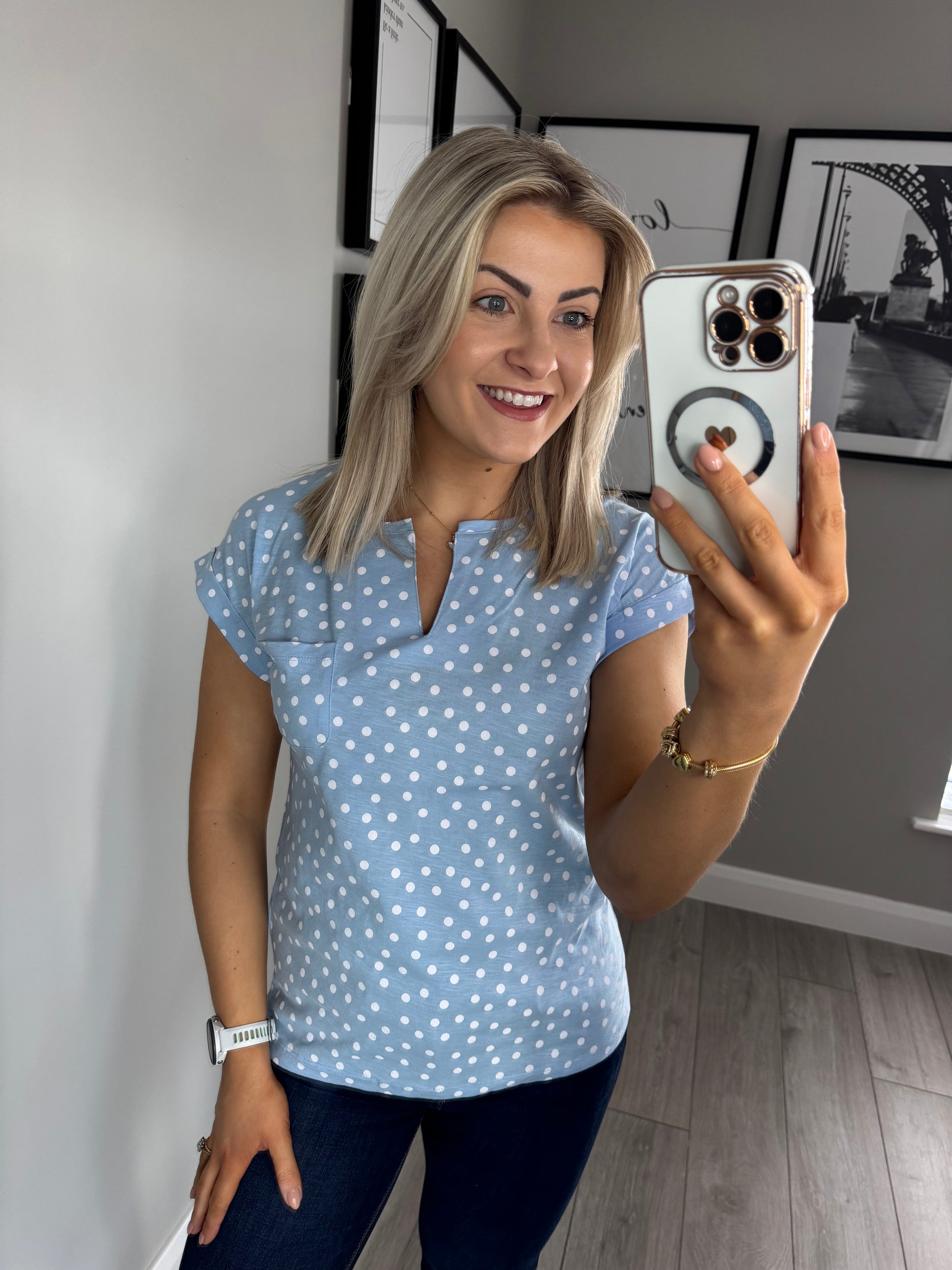 -Freequent two toned blue & white spotted tee with left pocket detail.