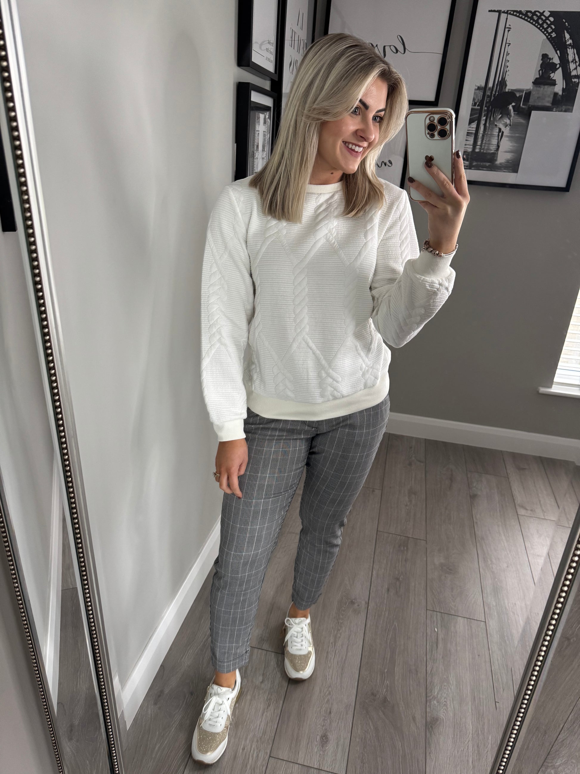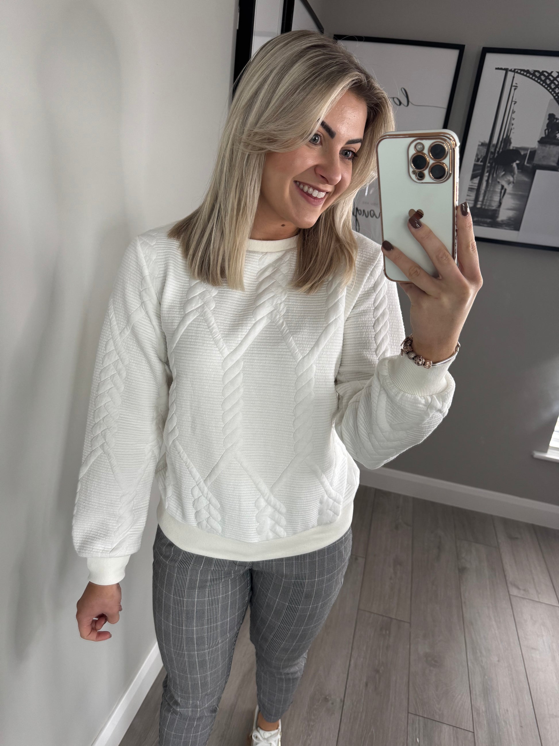 -Freequent soft off white sweater with subtle ribbed/self print design.