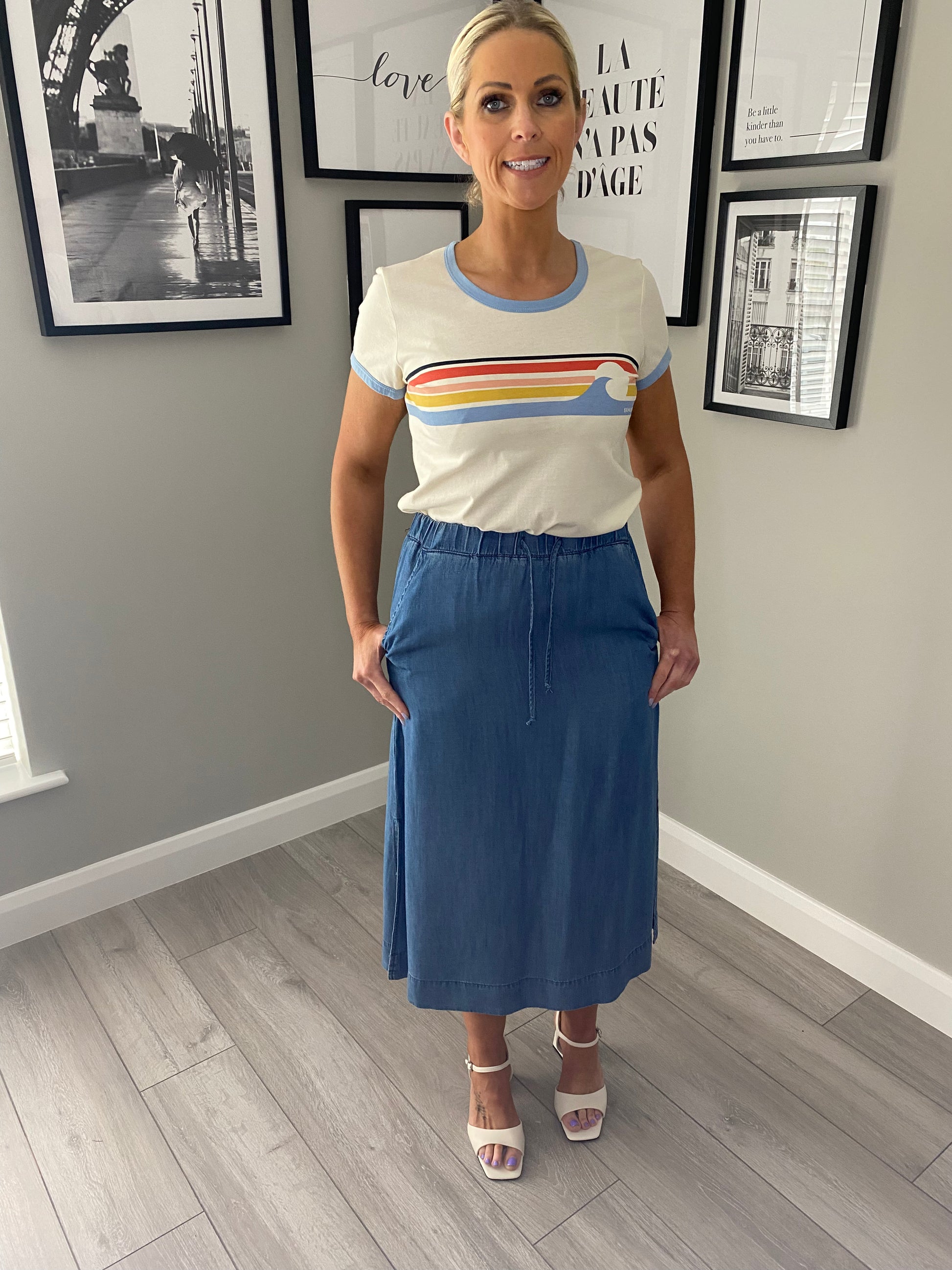 From the Freequent range we've got our lightweight long denim skirt. With elasticated drawstring waist & double pockets it's ideal for wee flat sandals for a day on holidays or a Summers day here! It's also got split sides for much freer of movements.