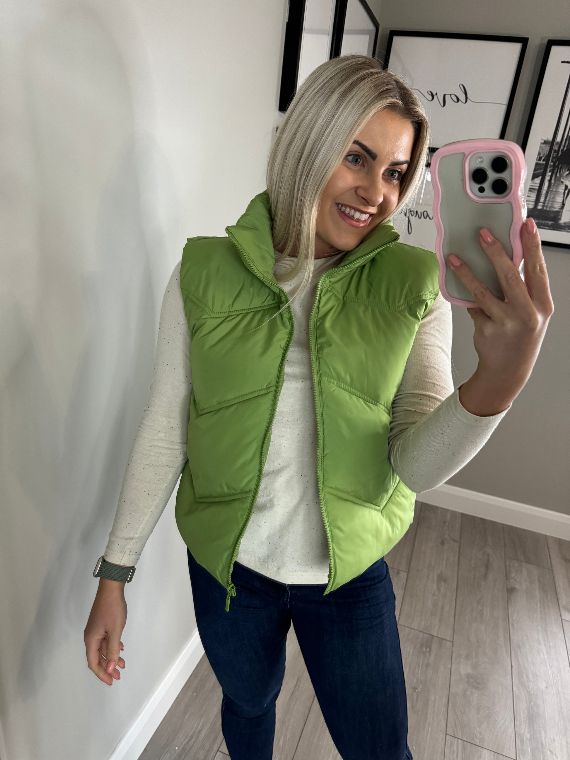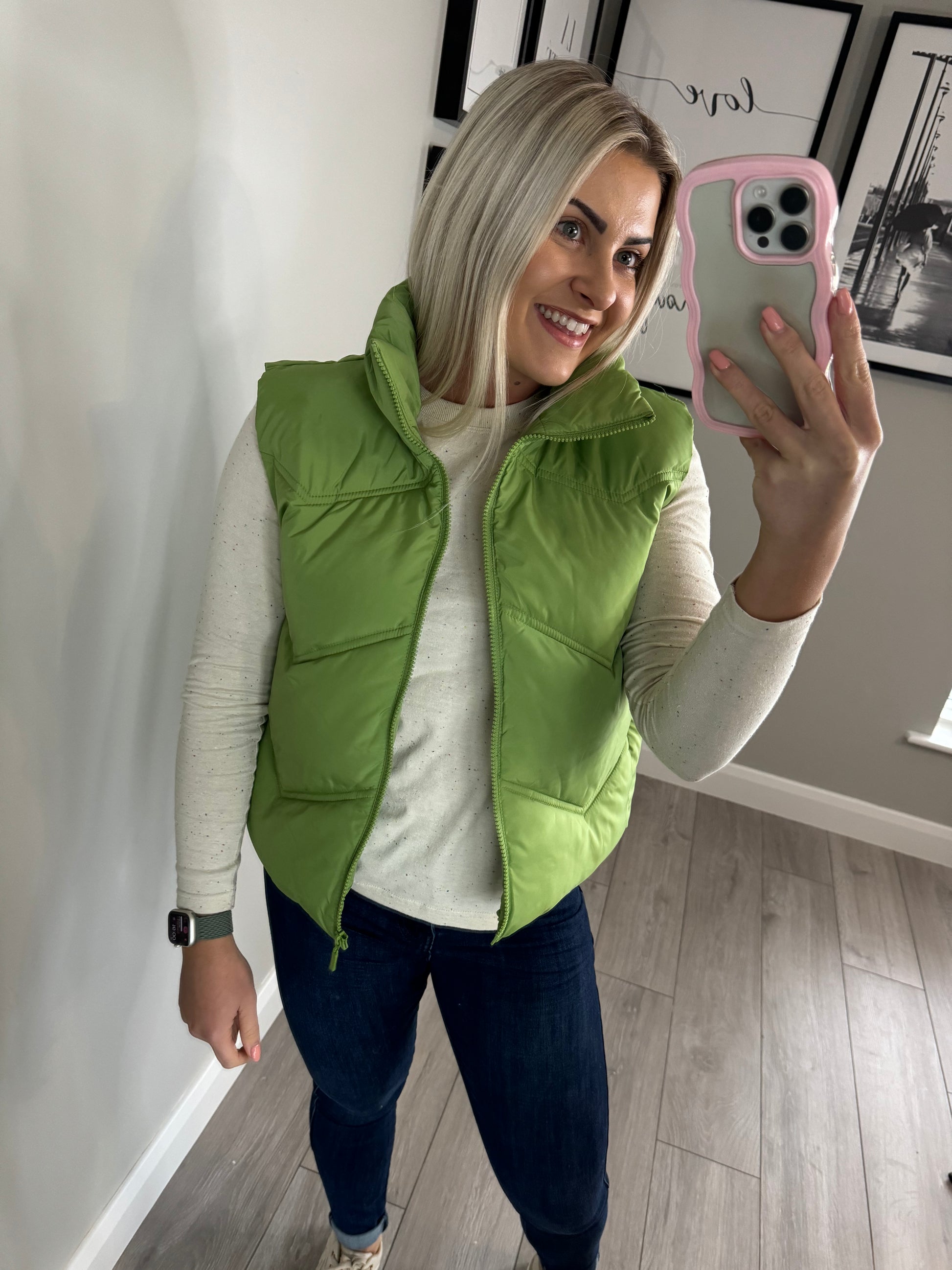 A gorgeous layer for your Winter wardrobe! In striking green our quilted look gilet is all about a bit of warmth without compromising style. True to size.