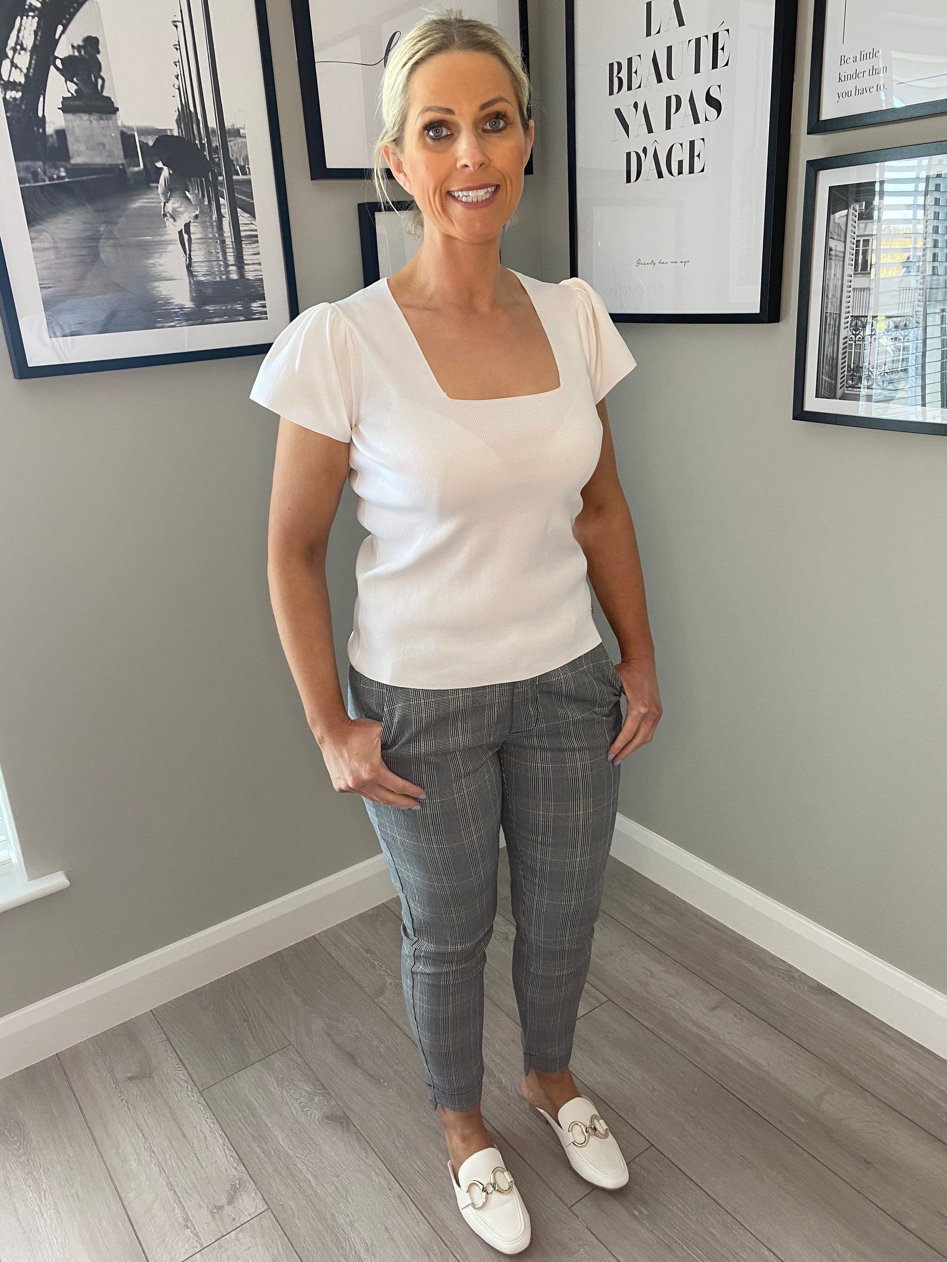 From the Freequent range we've got a stunning checked cigarette style trouser. With grey base & white/royal blue check they're both striking & comfortable. They have two pockets & normal button/zip opening as well as having a tiered hem (longer at the back).200038 We've teamed it with our Rant & Rave Breena white knit top & our Marco Tozzi white loafers.