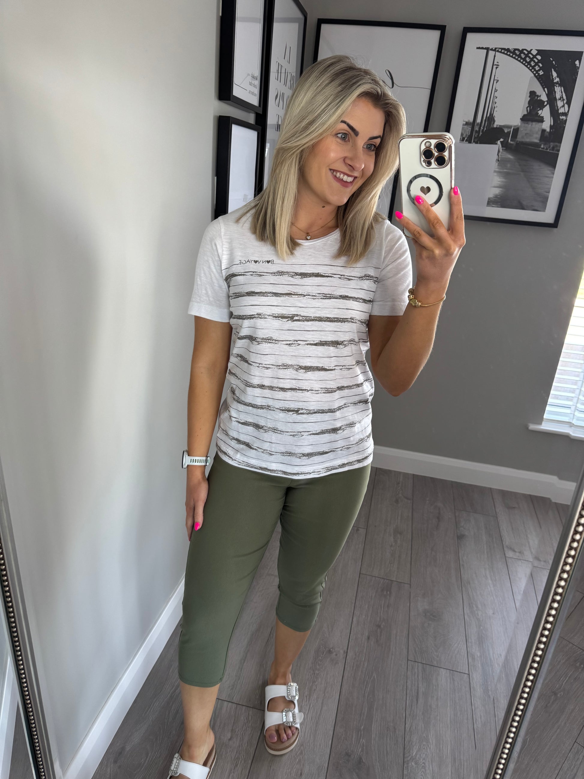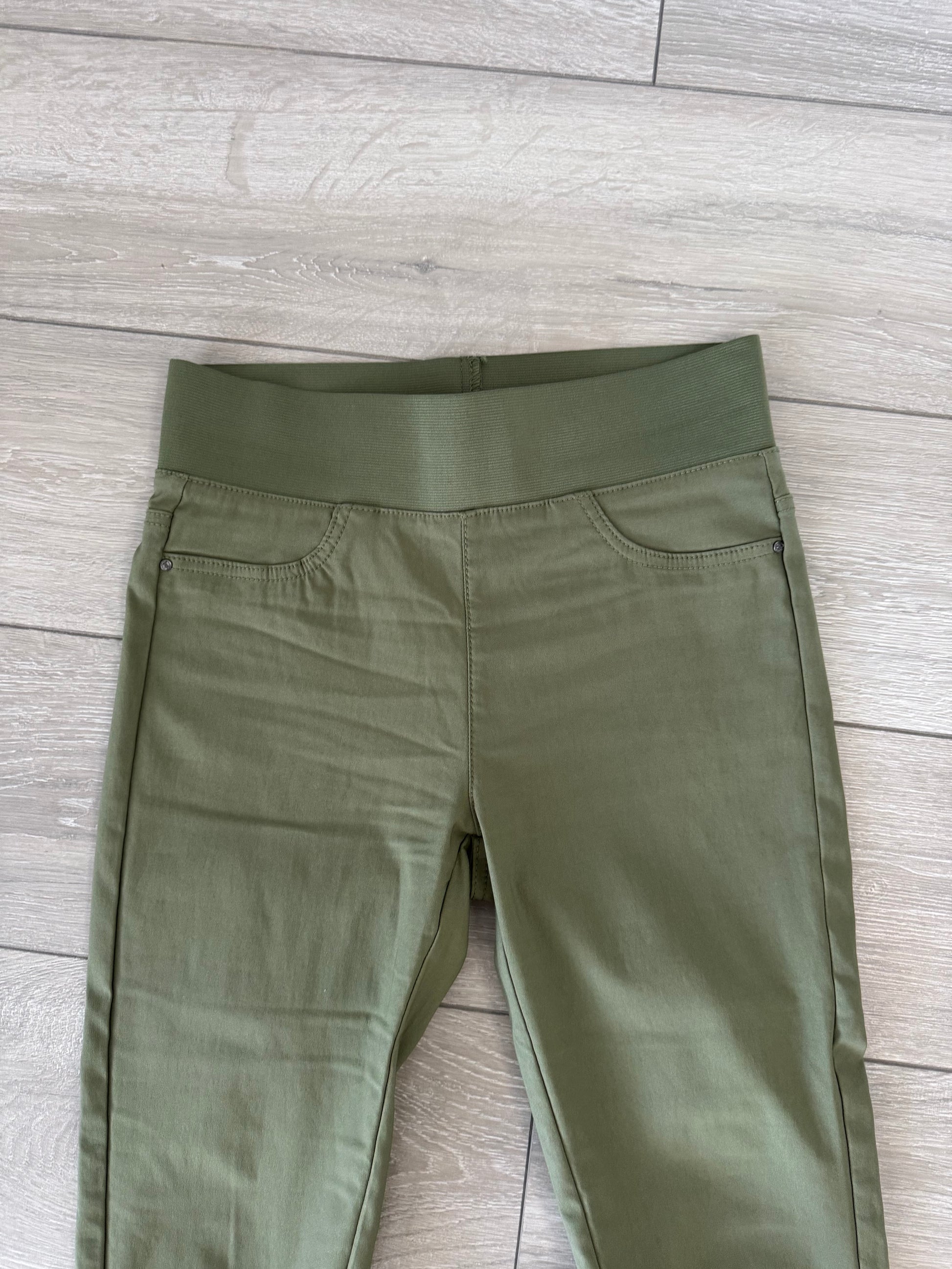 From the Freequent range we have our pull on crops in pedal pusher length (just below the knee). With large elasticated waist band these pull on without the bother of buttons or zips & are very comfortable on the waist. This is a khaki green colouring.118453