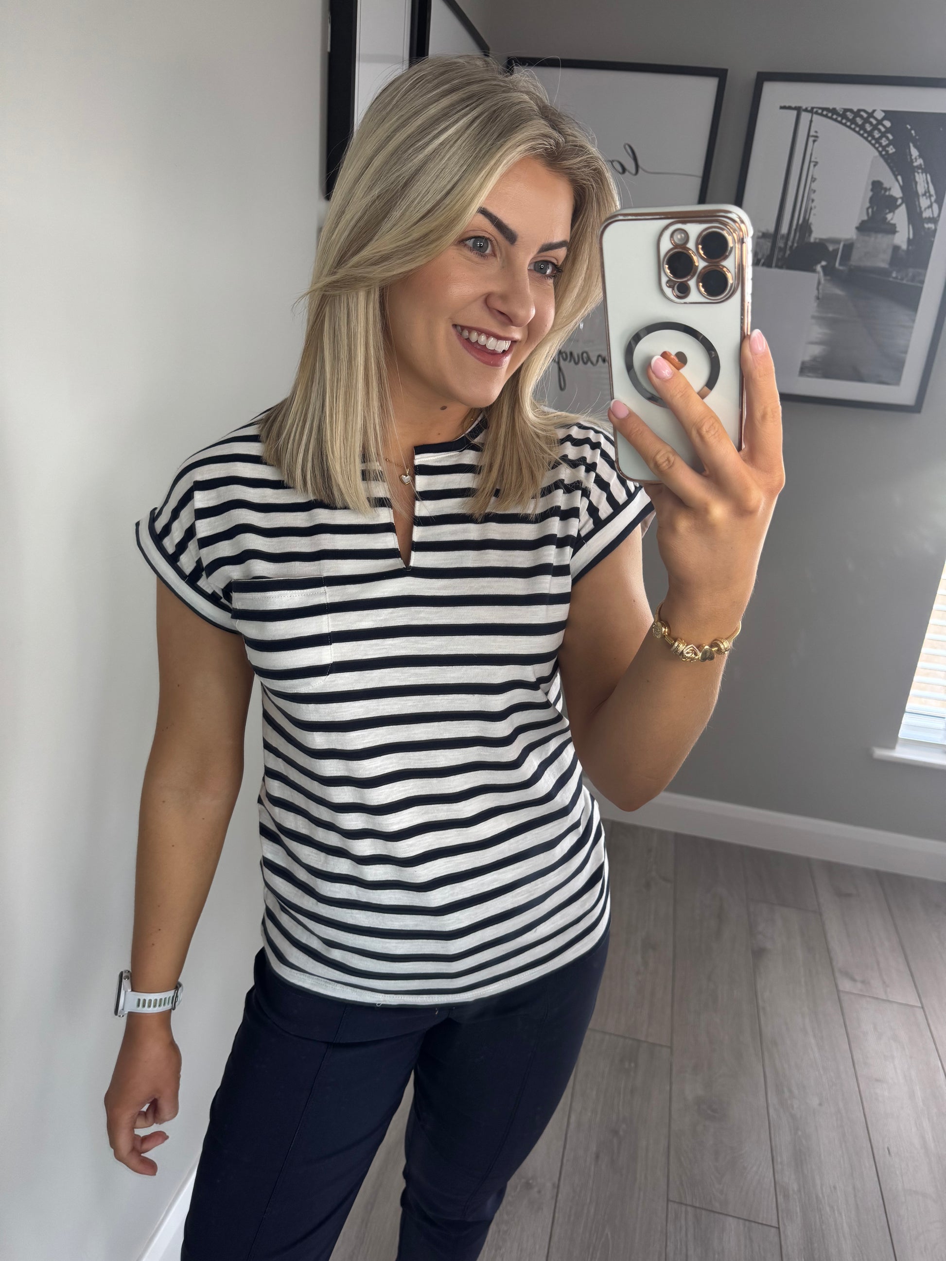 -Freequent two toned navy & white striped tee with left pocket detail.