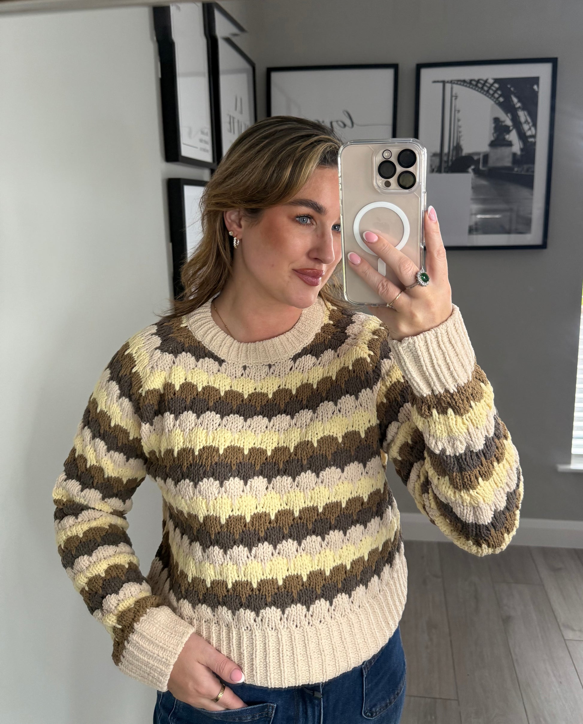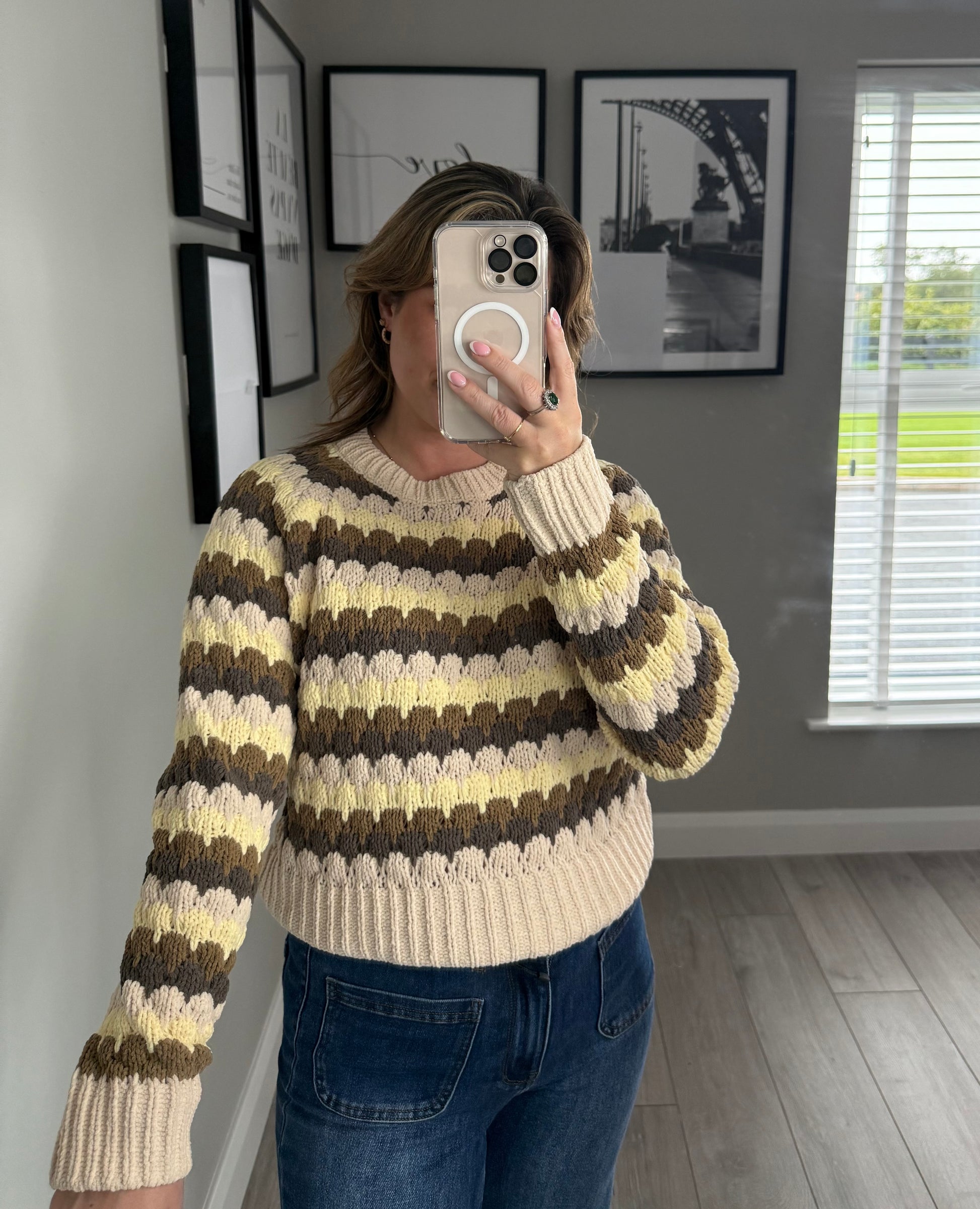 -Freequent four toned stripe effect knit jumper. Slightly cropped in beige, lemon, olive & khaki mix.