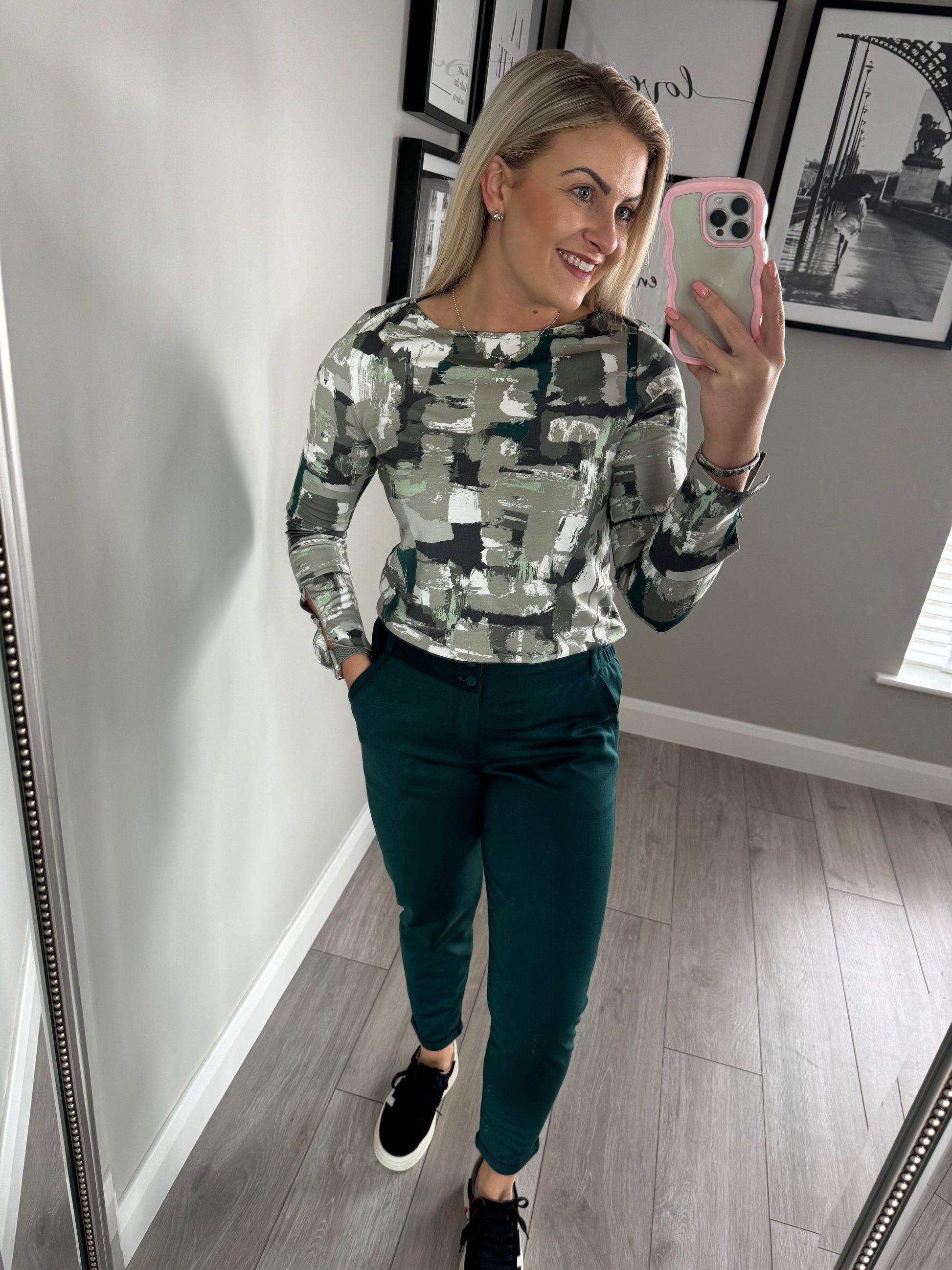 -Freequent jogger style trouser. Jersey cloth with elasticated waistband to the back (button & zip fastening to the front) in pine green.