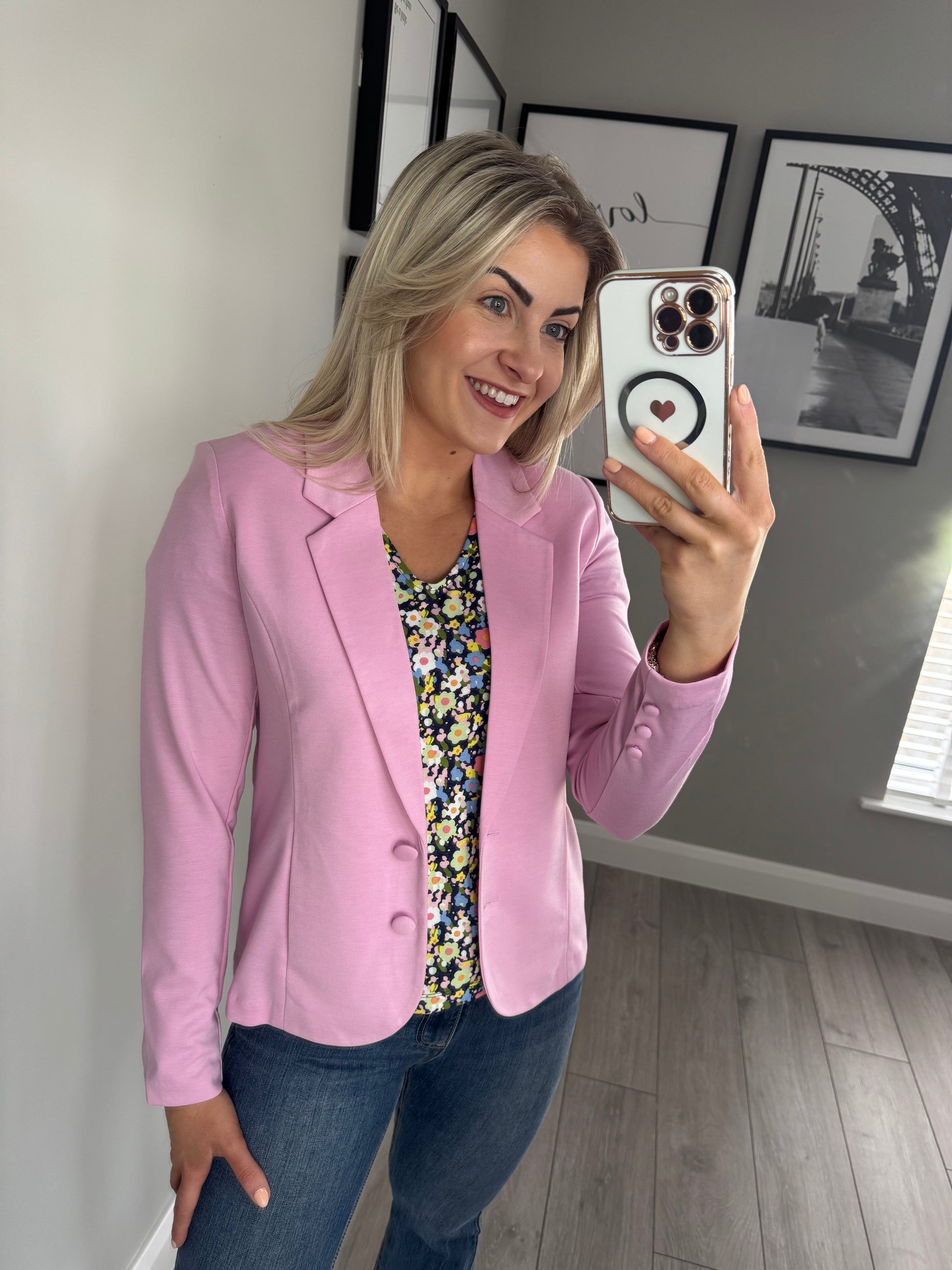-Freequent pink/lilac soft jersey blazer with flat lapels & double button fastening.