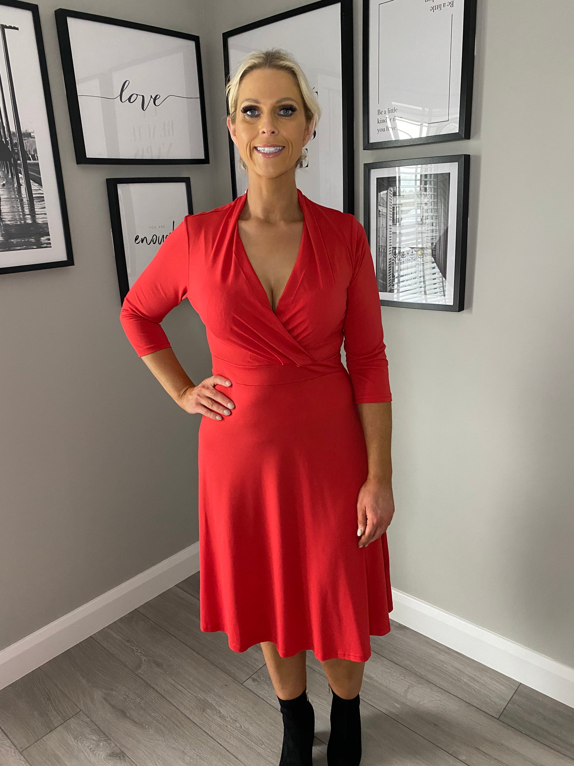 A wardrobe essential is a little swing dress! With light stretch it's both comfortable to wear & a sculpting fit. In sharp red it's got sculpting V neckline with light swing from the waist down. Style with or without tights.