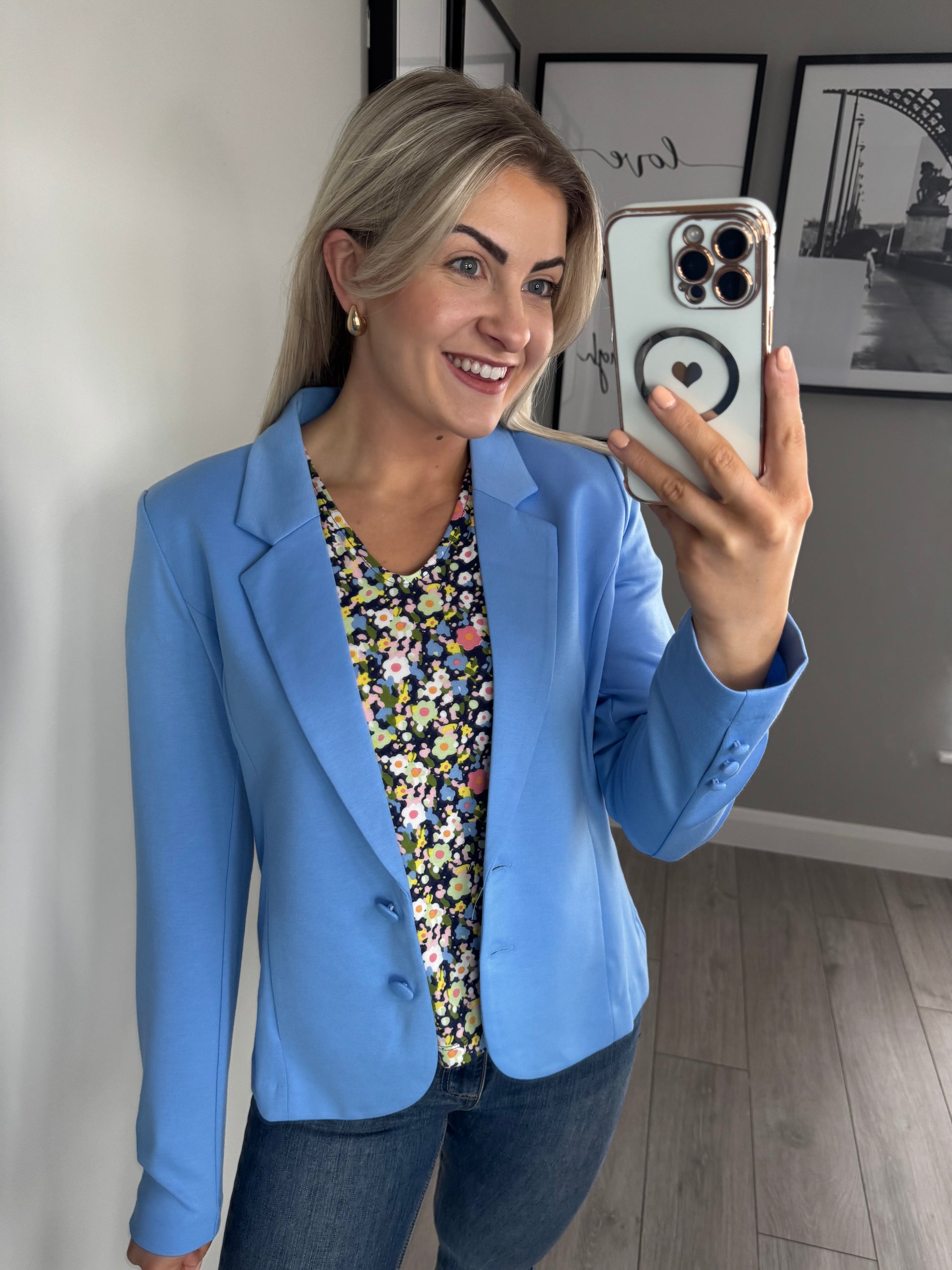 -Freequent soft/baby blue soft jersey blazer with flat lapels & double button fastening.