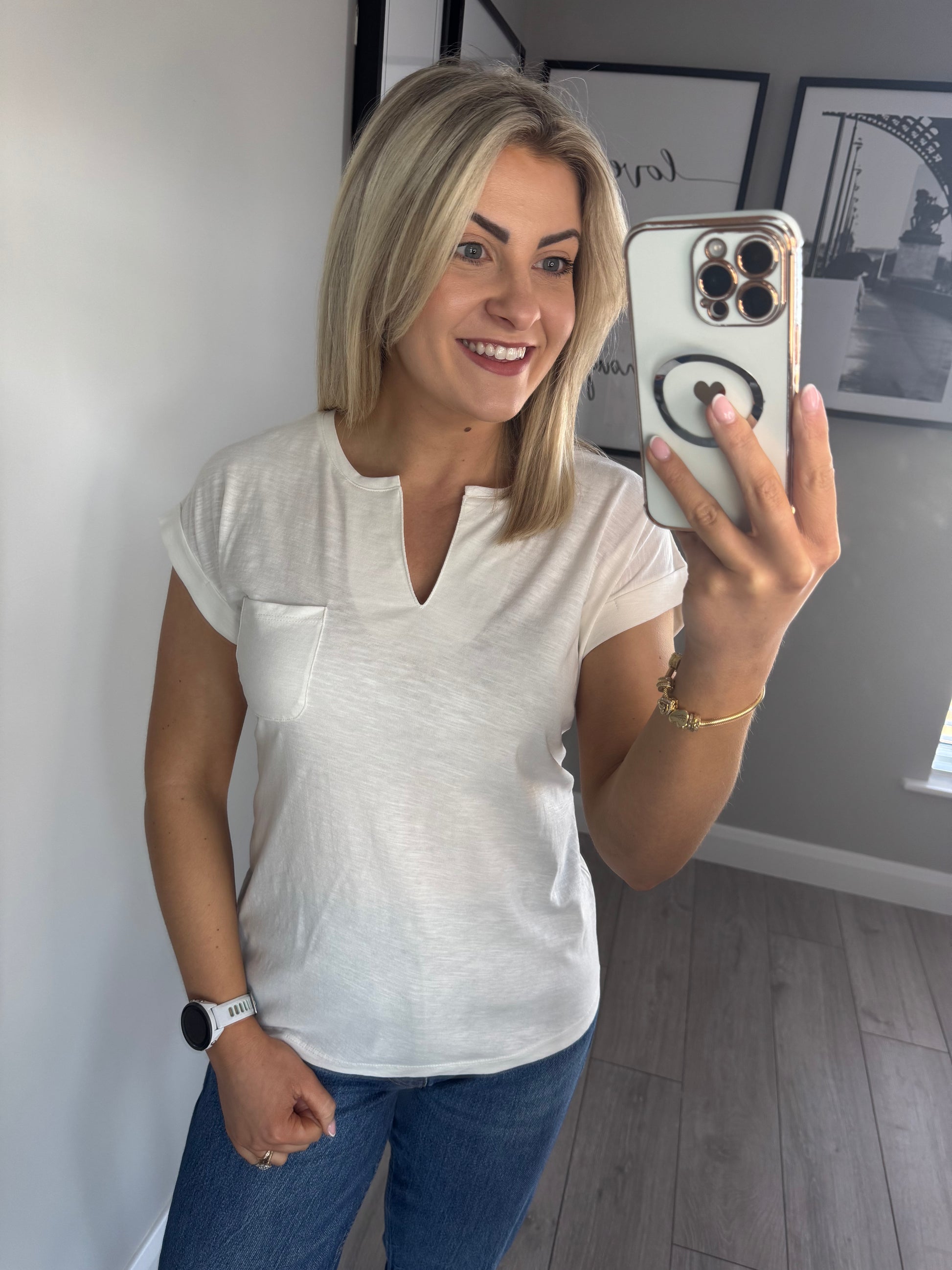 -Freequent plain t-shirt with V neckline, cap sleeves & small left breast pocket detail.