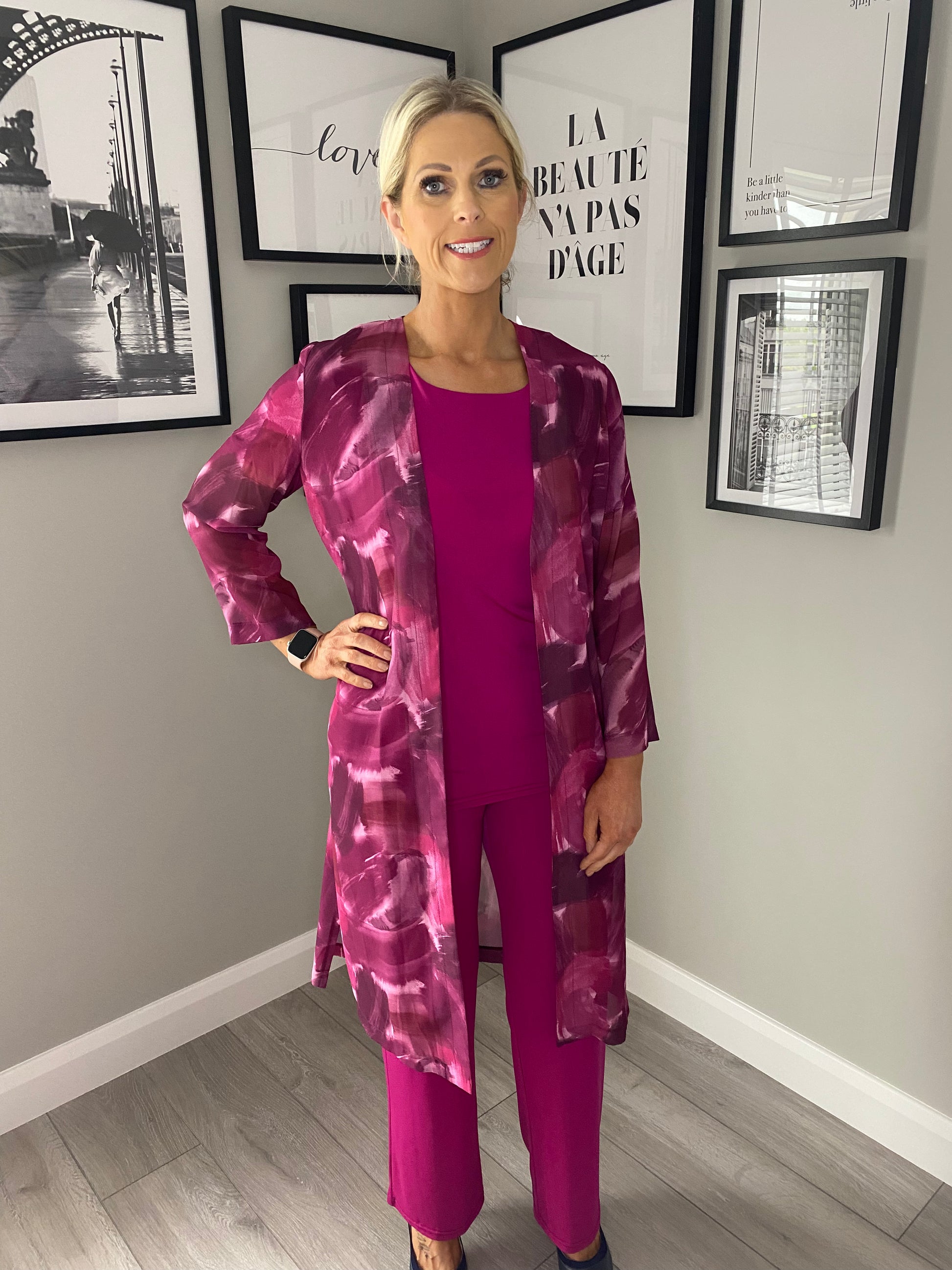 From the Glitz range our 3 piece trouser suits are just something else for those wanting trousers for a special occasion. The lightly stretched jersey trouser have a comforatble elasticated waist, with matching broad strap vest top & finished with chiffon two toned magenta & burgundy jacket.