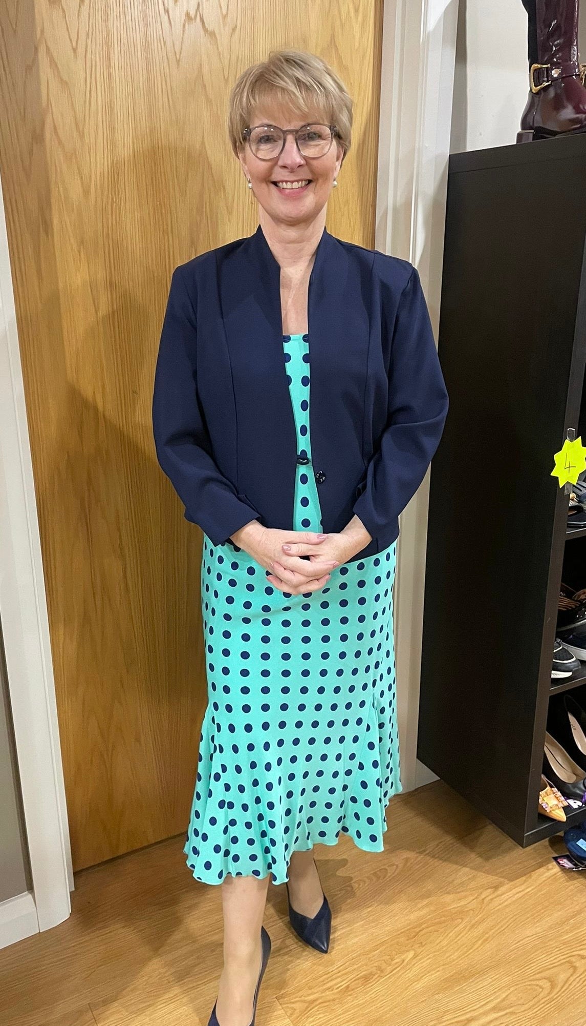 -Glitz two piece dress & jacket. Navy & mint spot dress with cap sleeve & lightly pleated skirt. Jacket to match.