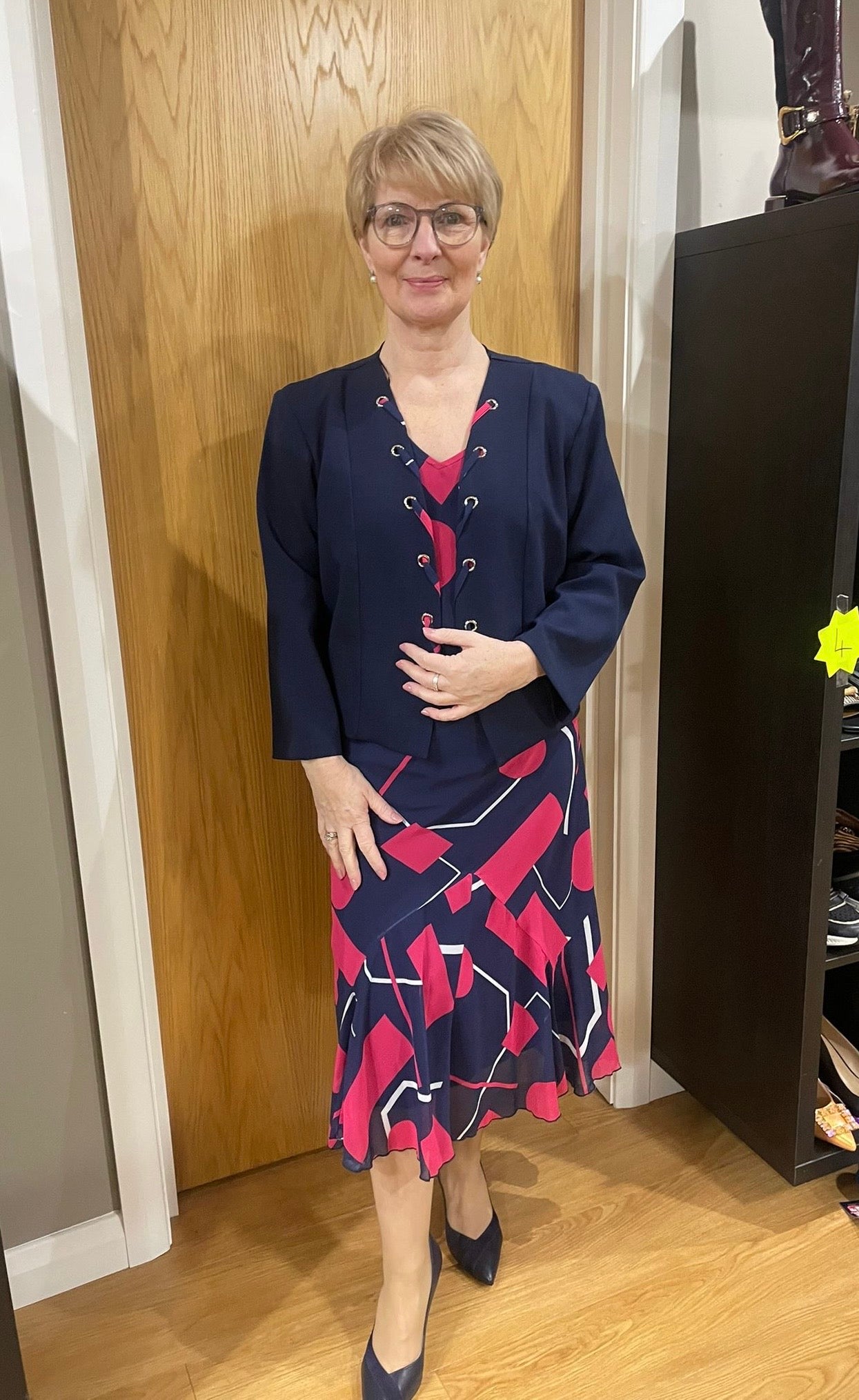 -Glitz two piece dress & jacket. Navy & cerise pink dress with cap sleeve & lightly pleated skirt. Jacket to match.