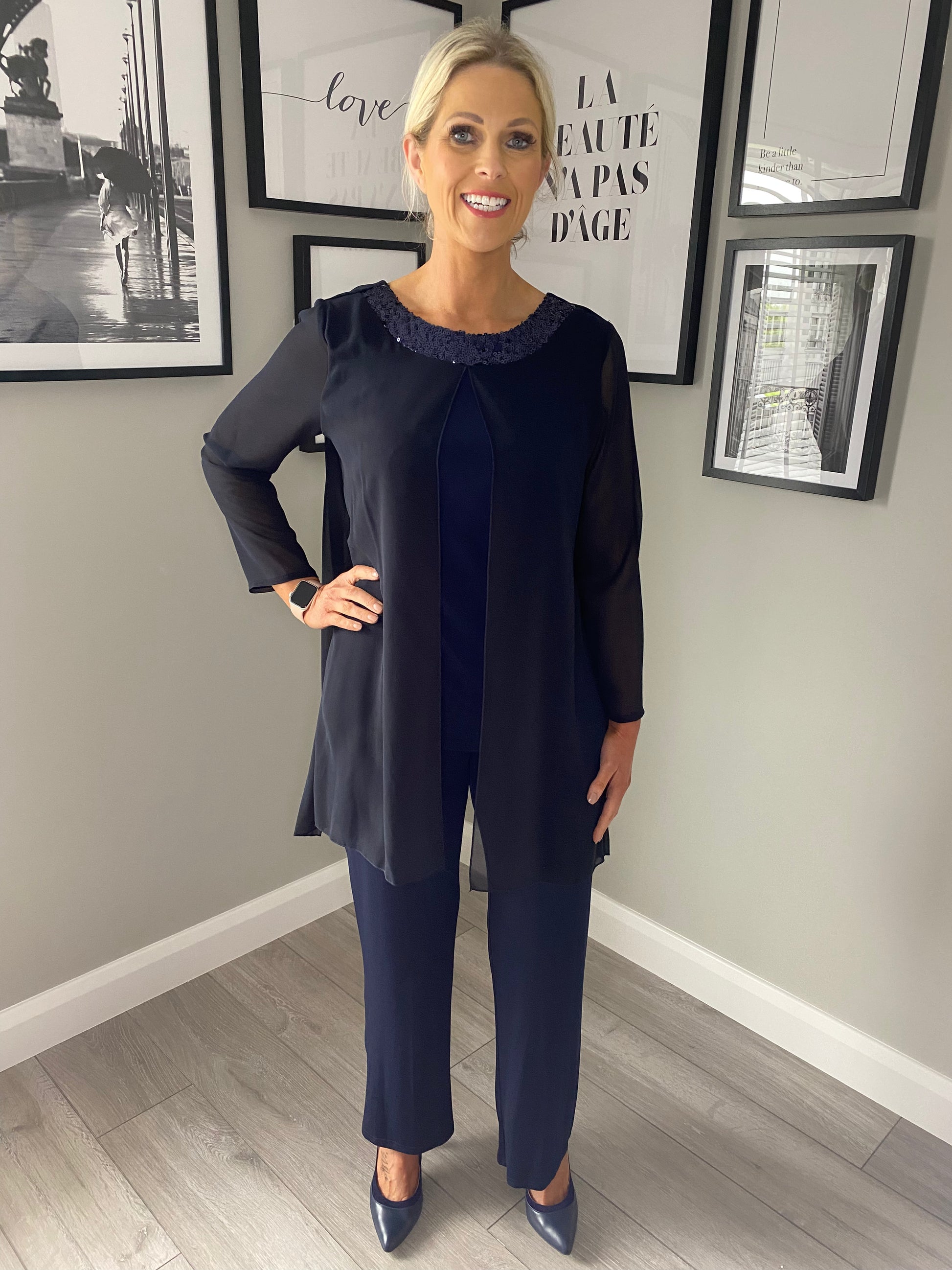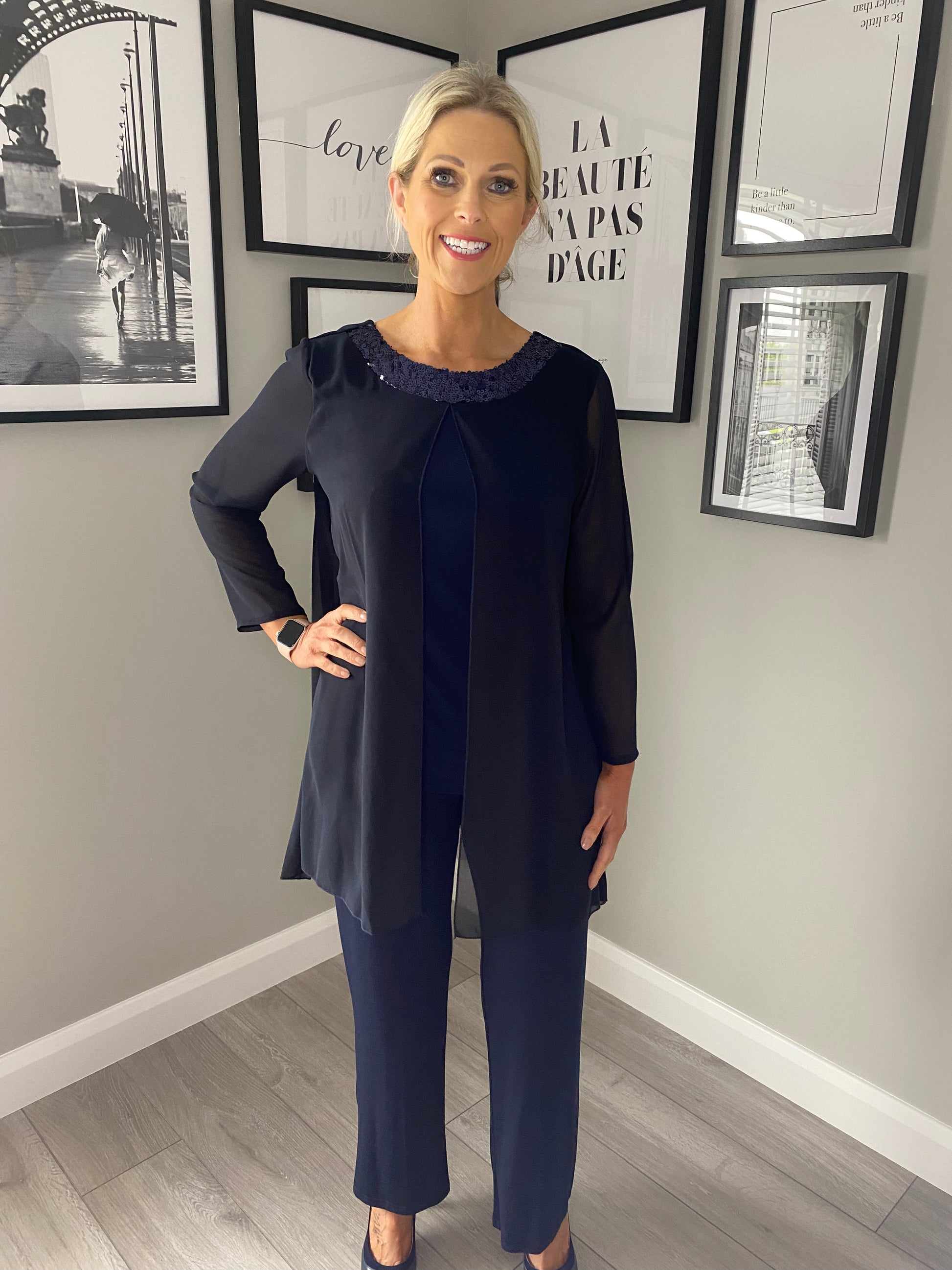 From the Glitz range our trouser suits are just something else for those wanting trousers for a special occasion. The lightly stretched jersey trouser have a comforatble elasticated waist, with matching chiffon layered top with sequin neckline.
