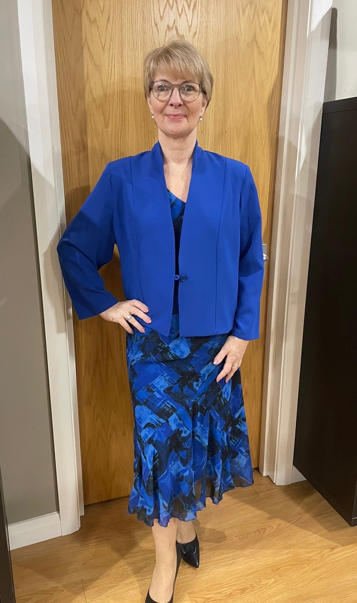 -Glitz two piece dress & jacket. Royal blue & black dress with cap sleeve & lightly pleated skirt. Jacket to match.